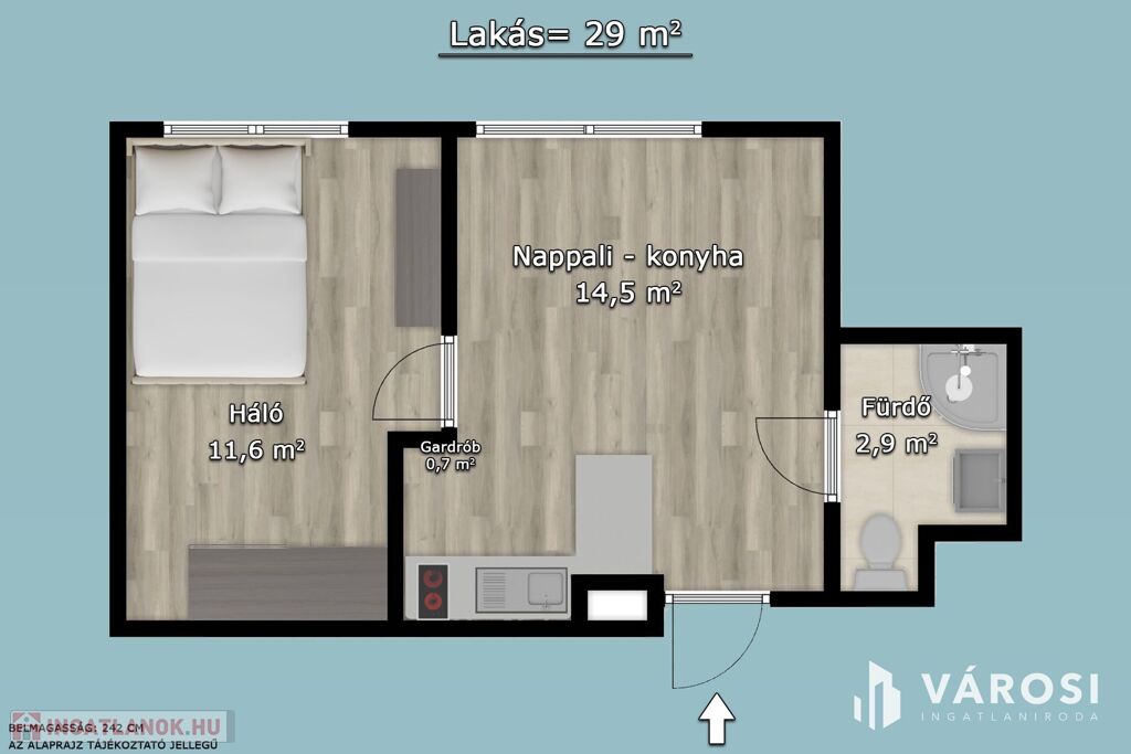 - Helyiségek: 1 nappali, konyhával, 1 háló, 1 fürdőszoba