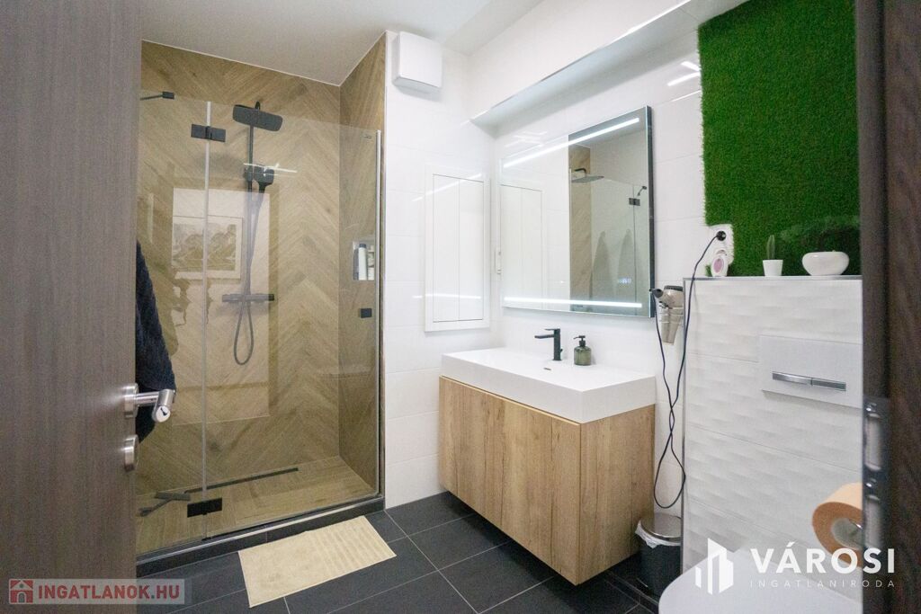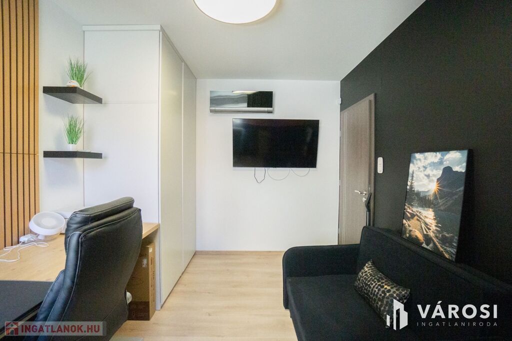 A lakásban felszerelésre került egy hűtő-fűtő klíma, ami biztosítja a mindig kellemes hőmérsékletet.