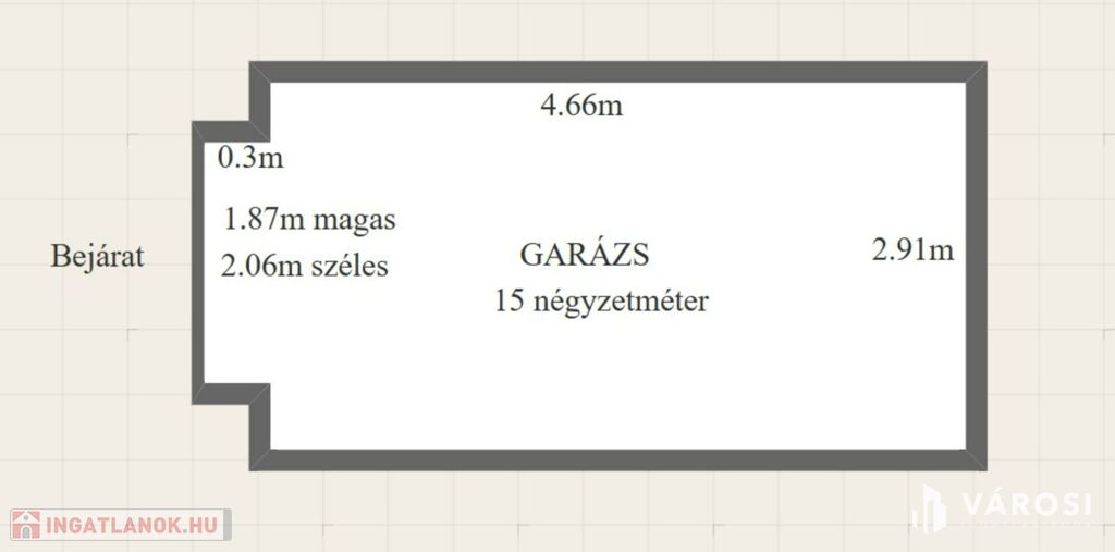 Az ajtónyílás szélessége 2,06m, magassága 1,87m, ehhez érdemes igazítani az autó méreteit. 4,66 m a belső faltól a belső hossz, 2,915m a belső szélesség, belső magasság 2,04m.