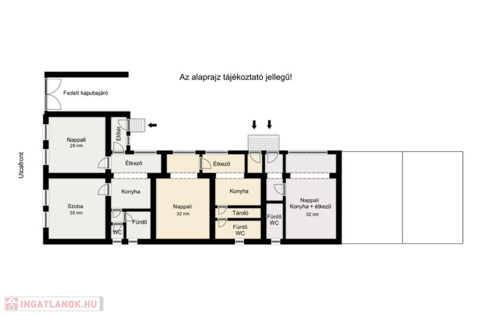 A társasház három különálló lakásból áll (külön közüzemi mérőórákkal). Méretük: az utcafronti lakás 91 nm, a középső lakás 61 nm, és a 3. lakás 43 nm.