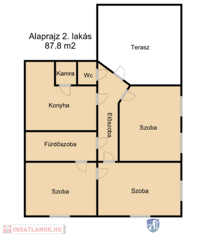 - 3 szobából, egy étkezős konyhából, 2 külön Wc-ből, egy fürdőszobából és egy előszobából áll.