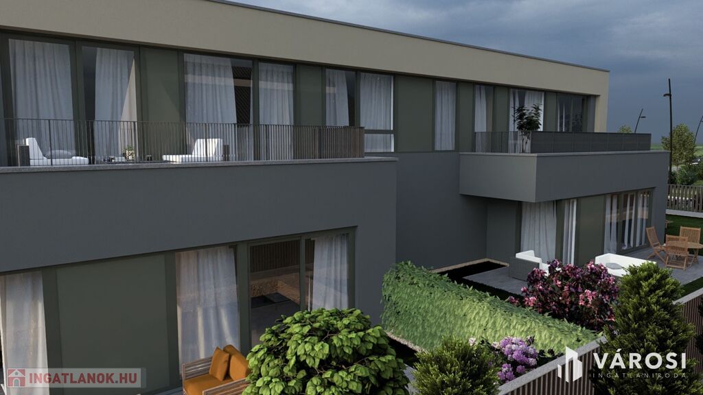 A ház csak a garázsnál érintkezik a szomszéddal, így valódi szeparáltságot biztosít – szinte önálló családi házként élhető.
