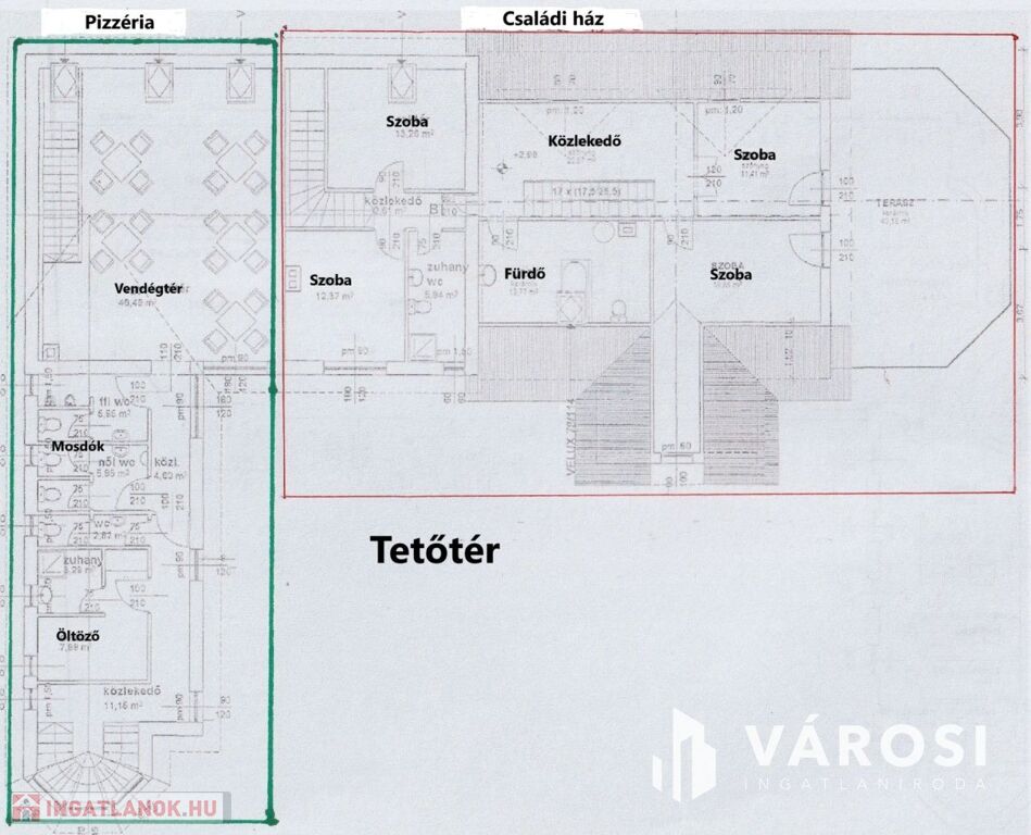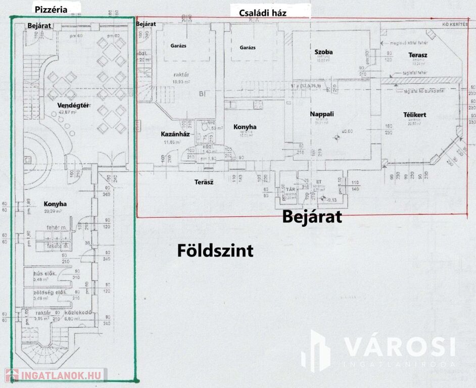 A 200 m2-es pizzéria-vendéglő önálló bejárattal és kerthelyiséggel rendelkezik. Azonnal bérbeadható. Az épületben vendégtér, mosdók és egy nagy méretű pizzakemence található. A vendéglő működtetéséhez szükséges helyiségek jó minőségűek, a hatósági előírásoknak megfelelnek. Az épület akár más jellegű üzleti vállalkozás számára is sokoldalúan hasznosítható.