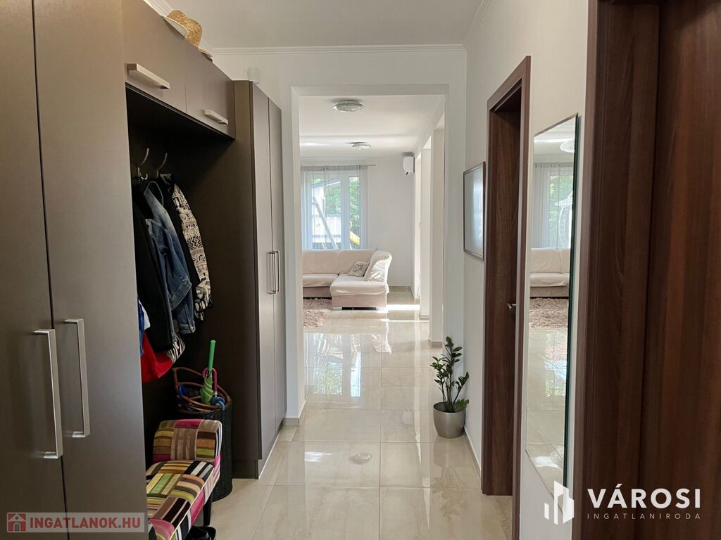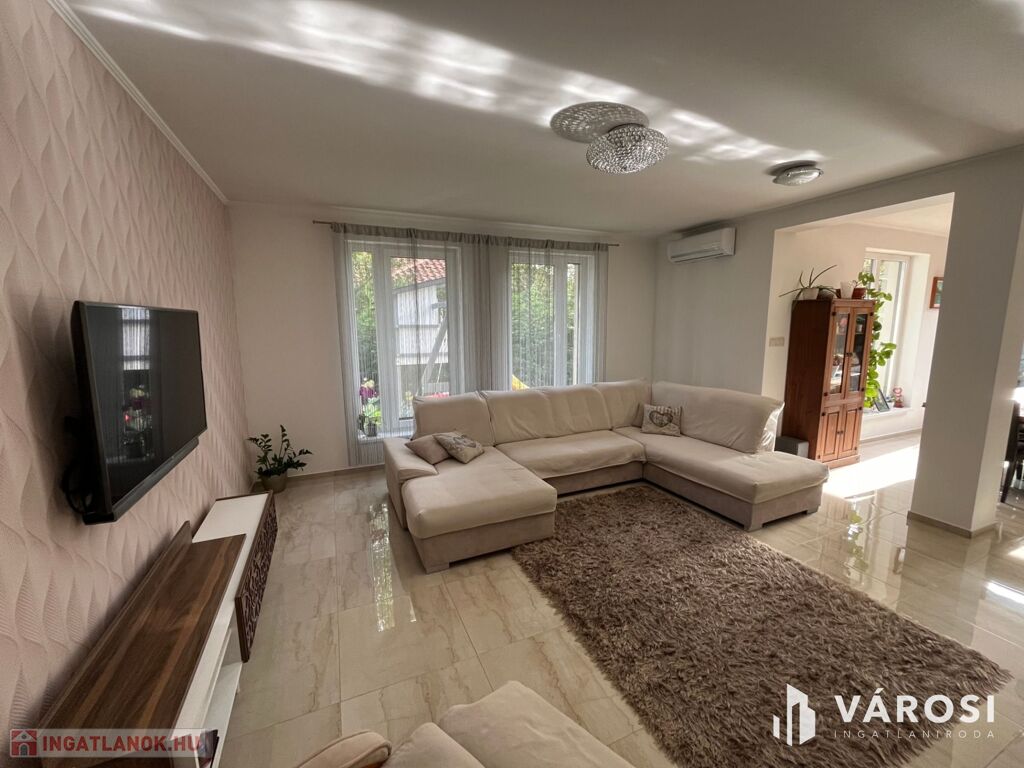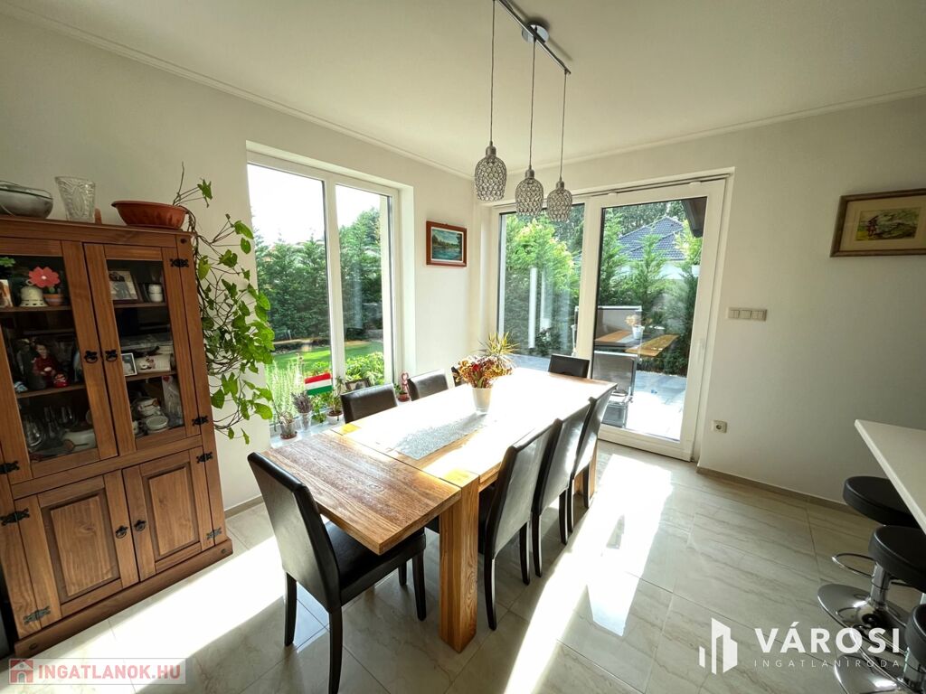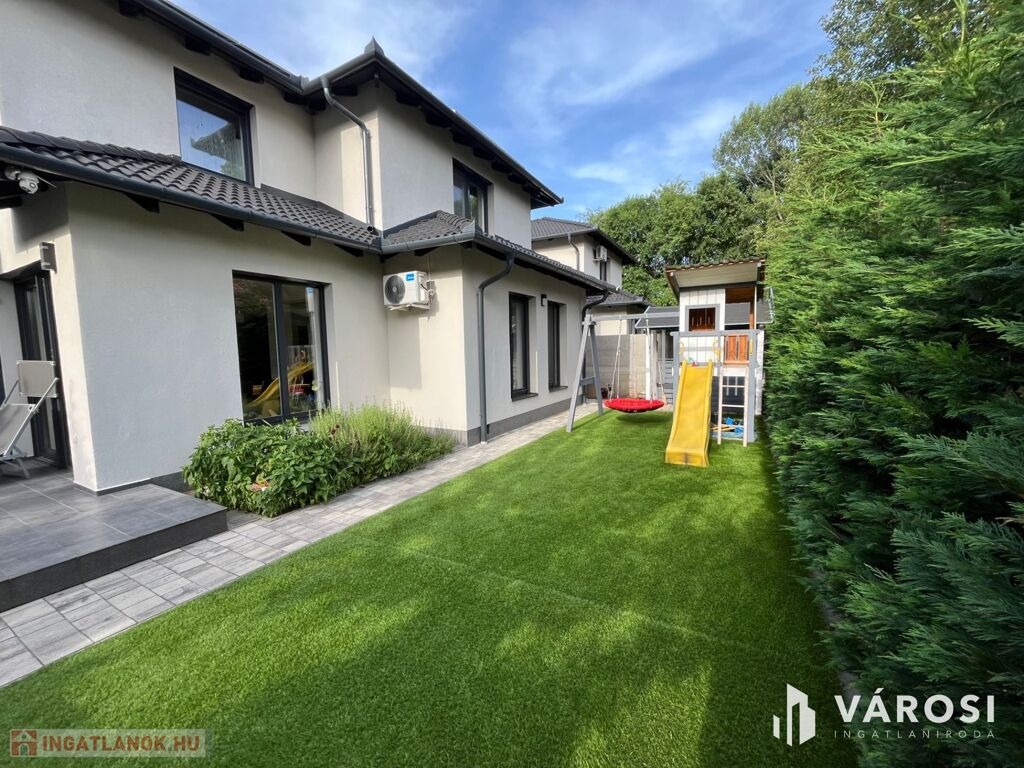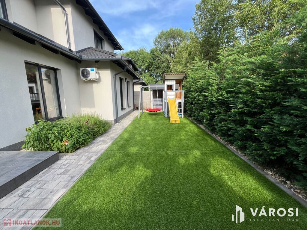 Debrecen Vámospércsi út közelében a Balla lakóparkban, gyönyörű madárcsicsergős zöldövezetben, 180 nm-es 4 szoba nappalis újszerű igényes ház eladó. Az ingatlanhoz dupla garázs tartozik, és szépen parkosított 470 nm-es kert van hozzá, ahol helyet kapott egy nagy fedett terasz, és a hátsó kertben egy gyereksarok játszóházzal. A ház alsó szintjén helyezkedik el a nappali, tágas étkező konyha amelyből közvetlen terasz kapcsolat van, egy szoba és egy zuhanyzós fürdőszoba. A felső szintre érkezve a közlekedőből három hálószoba nyílik és egy kádas fürdőszoba, plusz egy mosókonyha wc-vel. Az ingatlan valóban gyönyörű erdőkkel tarkított csendes zöldövezetben található, ahol tényleg megvan az emberben az igazi otthon érzés. Nézze meg próbálja ki, nem fog csalódni!