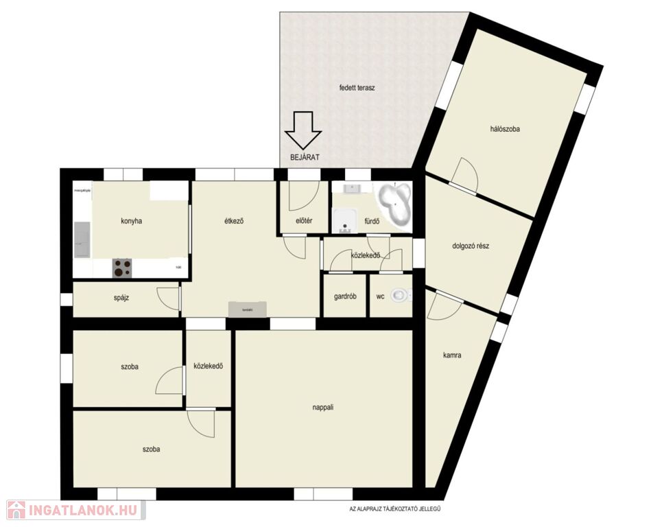 Elosztása szerint: 1 nagy nappali, 3 hálószoba, dolgozósarok, konyha, étkező, gardrób, kamra, kádas-zuhanyzós fürdőszoba, valamint külön WC elrendezésű.