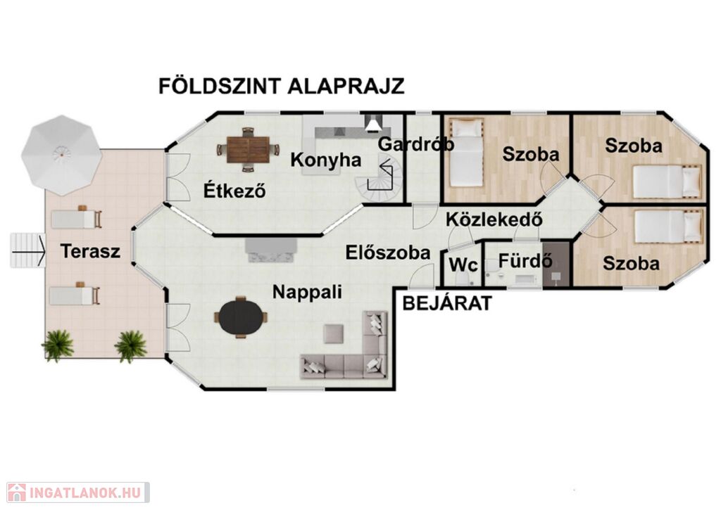 A tágas, közel 45nm-es nappali az ingatlan egyik oldalán míg a lakószobák a másik oldalán helyezkedik el lehetőséget kínálva a társasági élet számára.