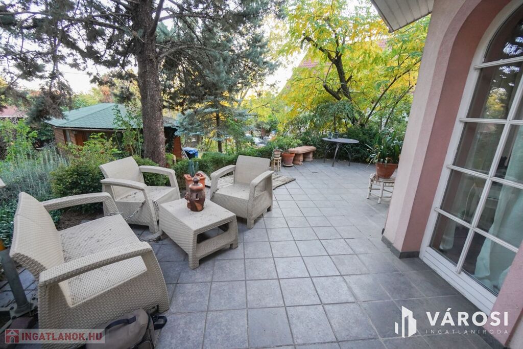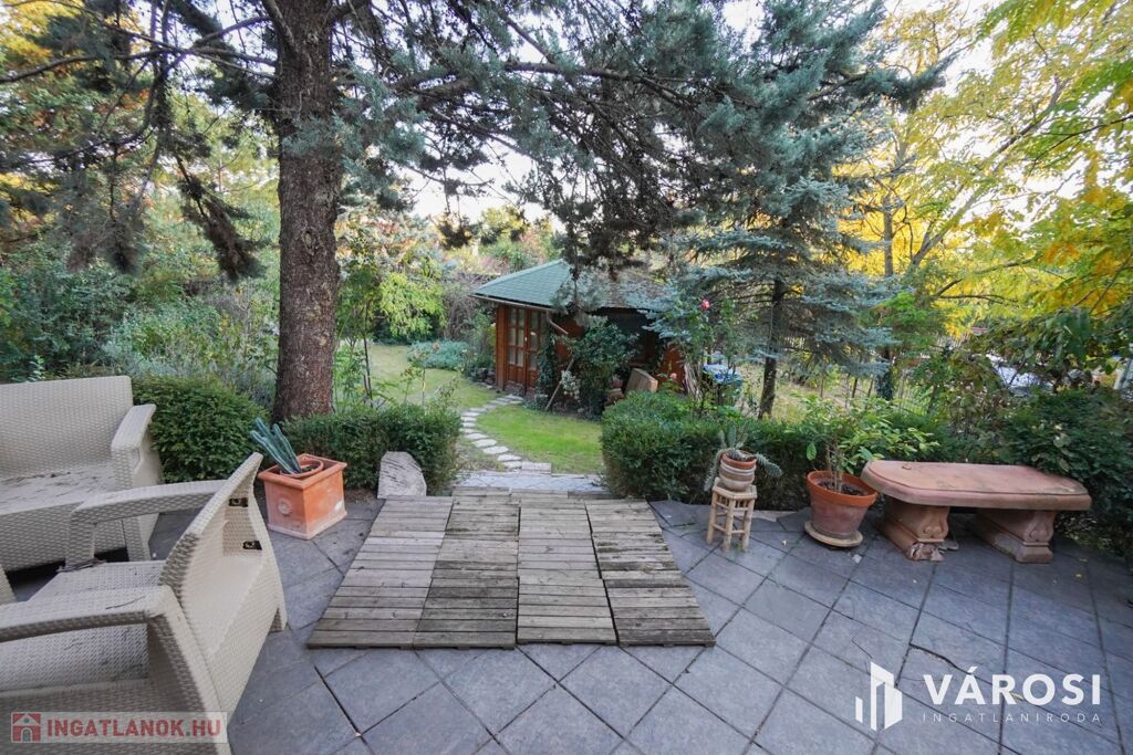 920nm-es kert melyben helyet kapott az épített sütőgető mellett egy közel 30nm-es kerti pavilon szaunával és tárolókkal, összkomfortos így akár lakhatásra is alkalmas.