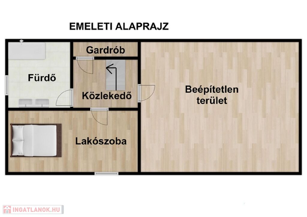 Az emeleti részen a szoba, fürdőszoba mellett közel 60nm-es beépíthető terület maradt melyre akár még 2-3 szobát is elhelyezhetünk.