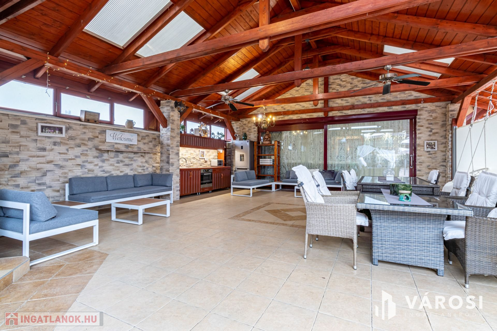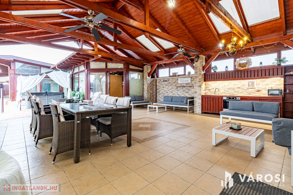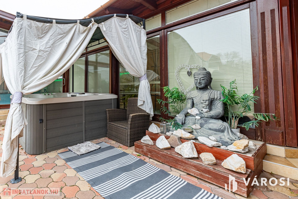 A rendezett udvarban több autó kényelmesen parkolhat, az elektromos kapun keresztül belépve pedig igazi privát oázis várja: fűtött medence, jacuzzi, szauna, szolárium, kerti sütögető, napozóágyak és egy hatalmas fedett terasz, amely egy teljesen felszerelt kerti konyhát és hangulatos pihenősarkokat rejt. Mindez olyan érzést nyújt, mintha minden nap nyaralna!