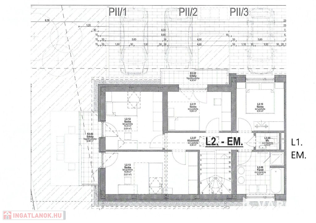 4 db hálószoba, fürdőszoba (dupla mosdó-zuhanyzó-fürdőkád), külön wc helyiség, közlekedő és 2 db erkély került kialakításra (mely 3 szobához kapcsolódik).