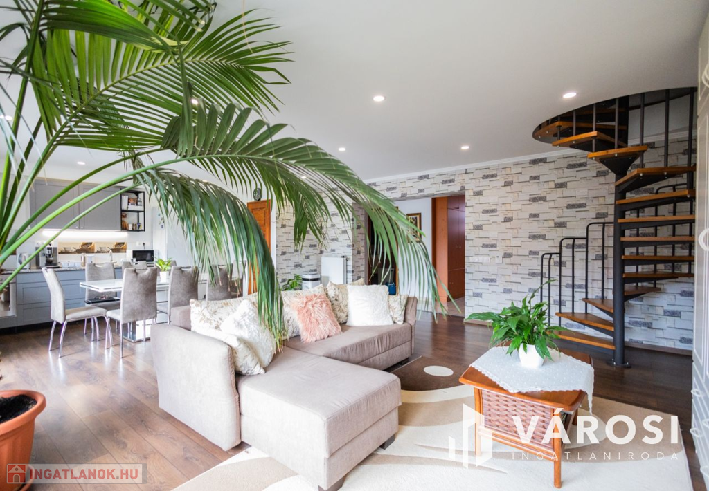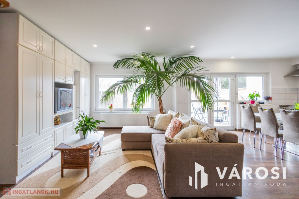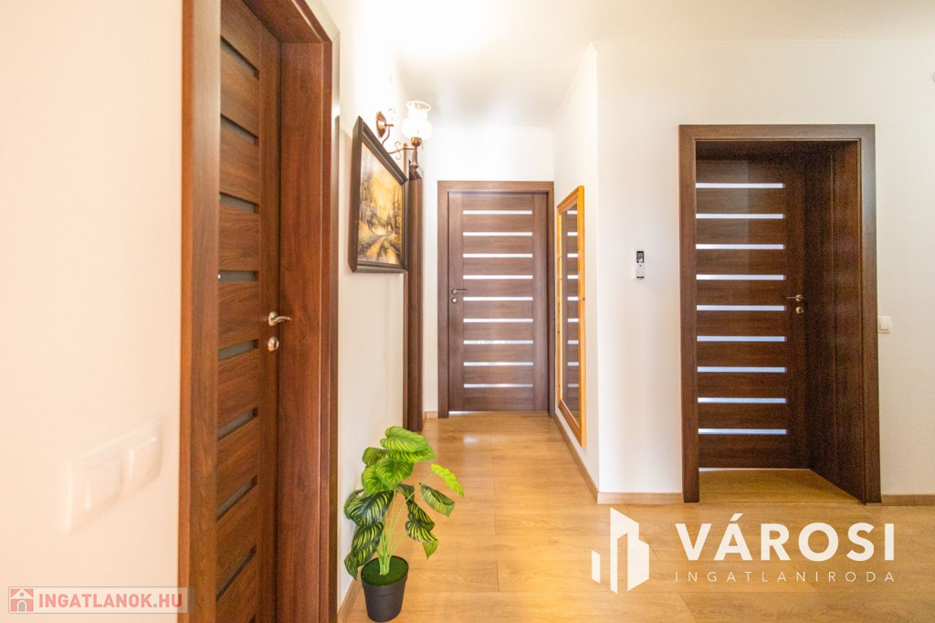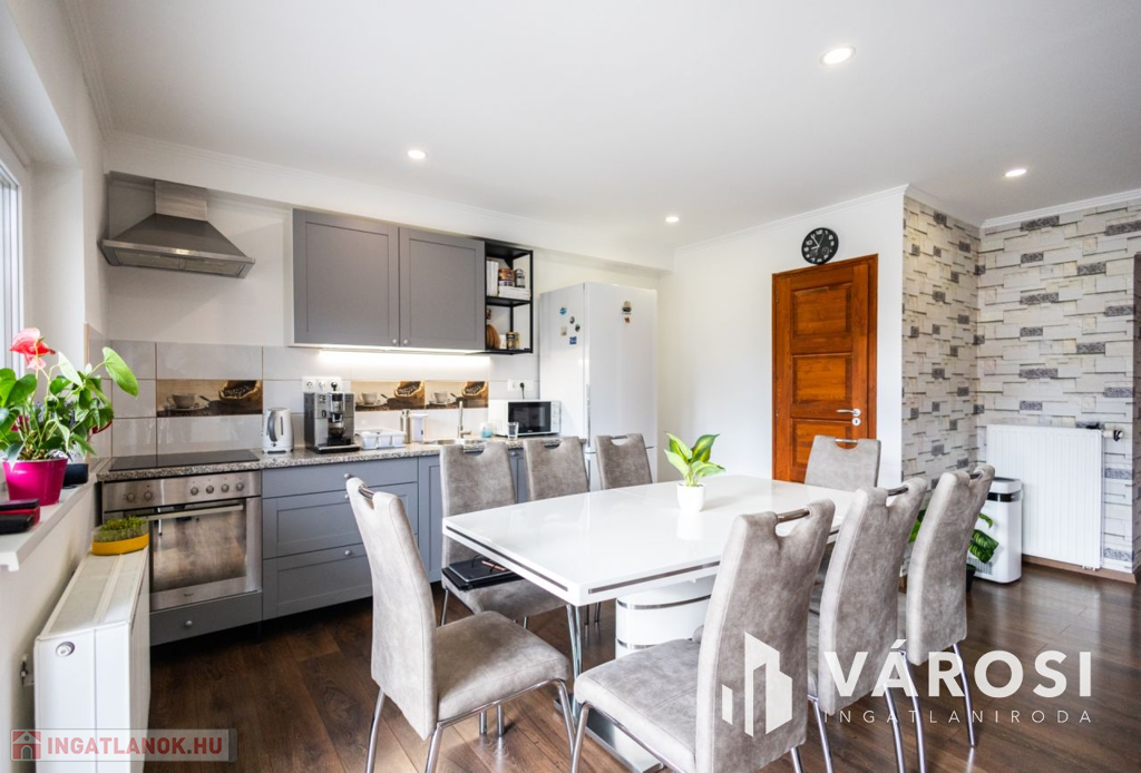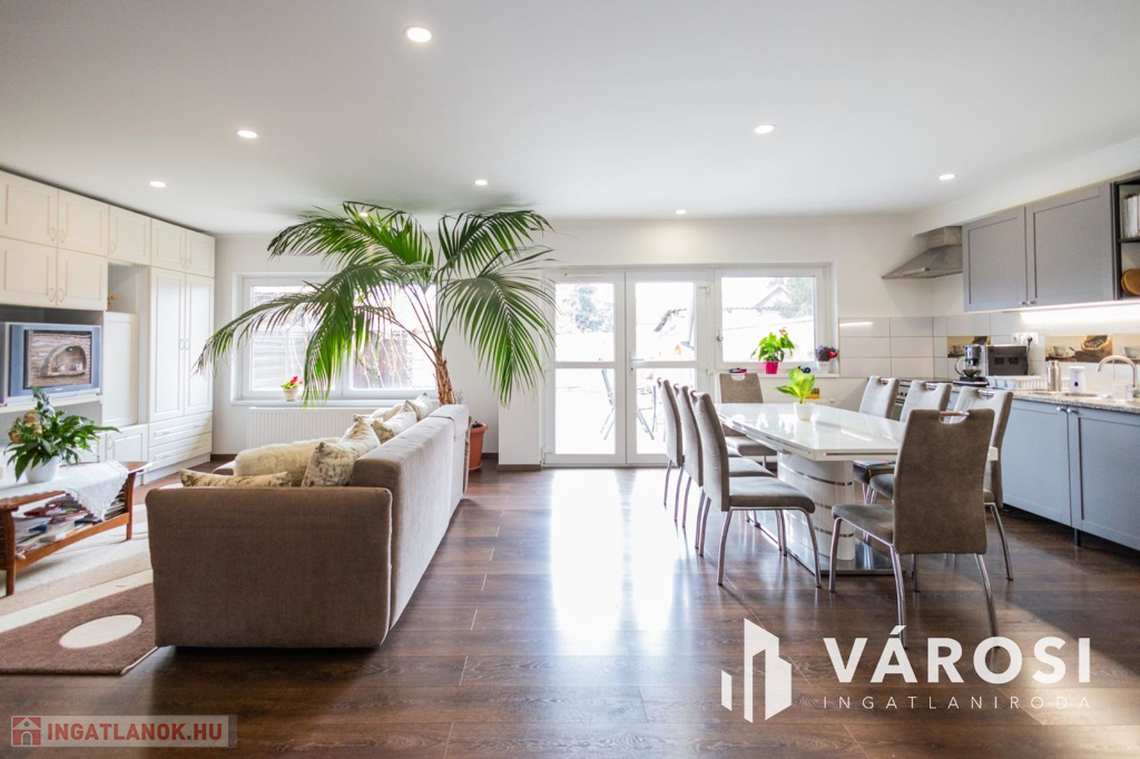 Gyula belvárosában, mindenhez közel eladóvá vált egy 207 nm alapterületű, felújított ikerház. Az ingatlan két szintes és különlegessége, hogy az amerikai konyhás nappali mellett a földszinten található fürdőszoba és hálószoba is, emellett a garázsból is ki lett alakítva egy tágas konyharész is.. Az emeleten további 4 szoba, két tágas loggia és külön fürdő és WC található. A ház tégla falazatú és 2017-ben teljeskörű felújításon esett át, melynek keretében: