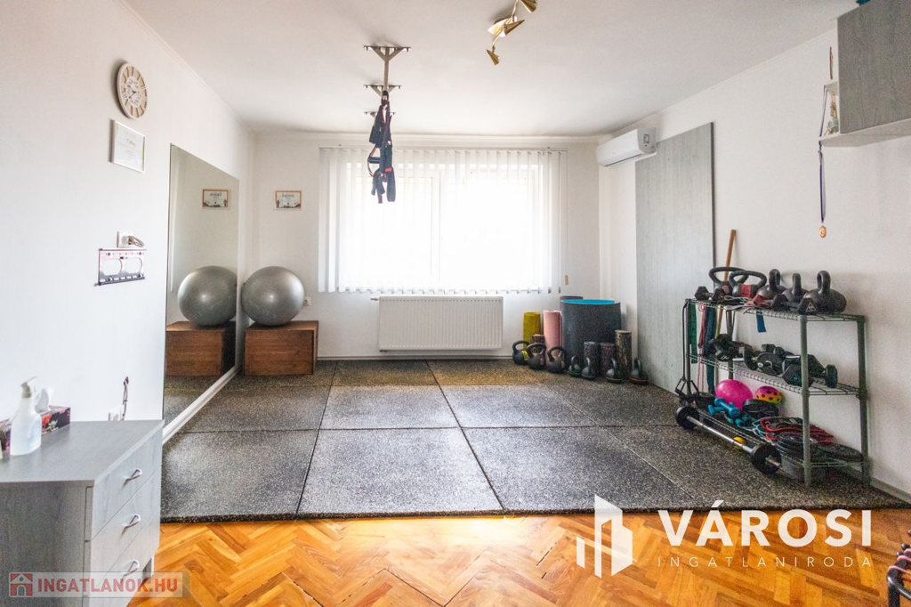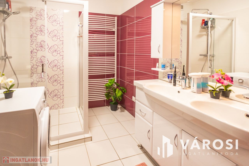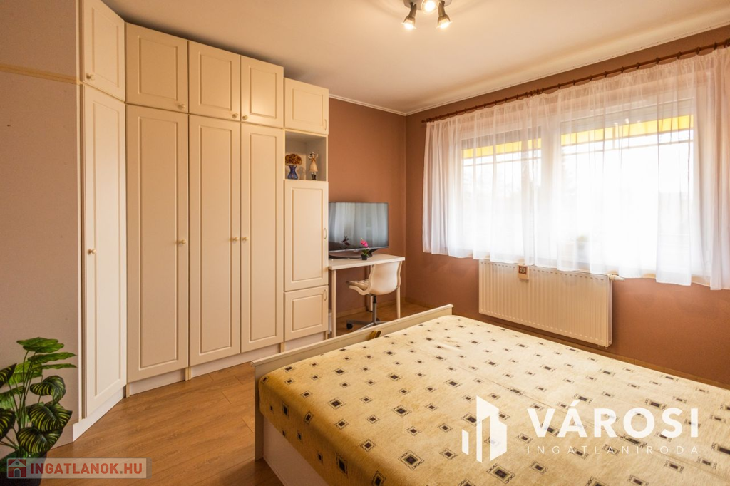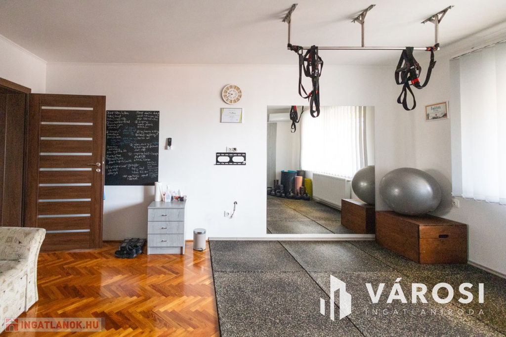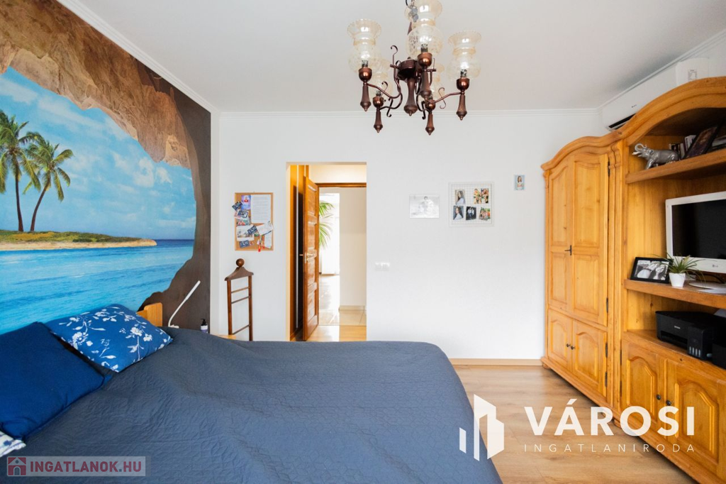 Gyula belvárosában, mindenhez közel eladóvá vált egy 207 nm alapterületű, felújított ikerház. Az ingatlan két szintes és különlegessége, hogy az amerikai konyhás nappali mellett a földszinten található fürdőszoba és hálószoba is, emellett a garázsból is ki lett alakítva egy tágas konyharész is.. Az emeleten további 4 szoba, két tágas loggia és külön fürdő és WC található. A ház tégla falazatú és 2017-ben teljeskörű felújításon esett át, melynek keretében: