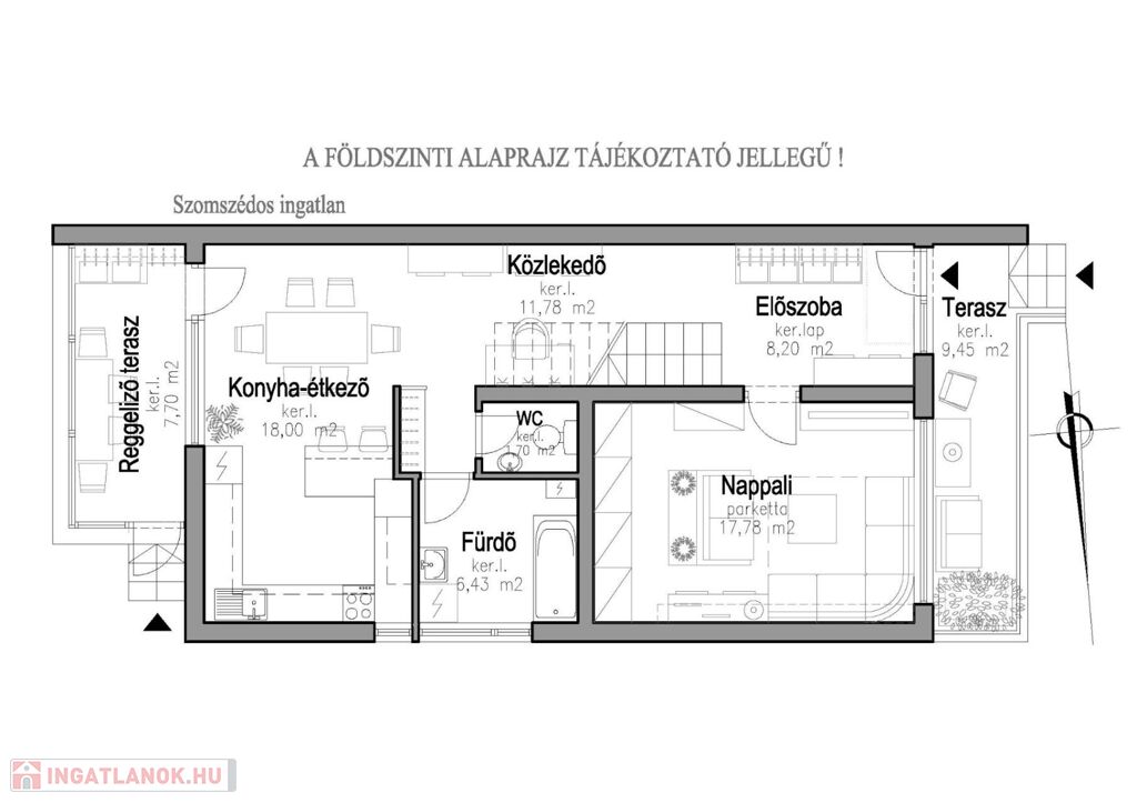 -Közlekedő (fa lépcsővel): ~12,00 m2