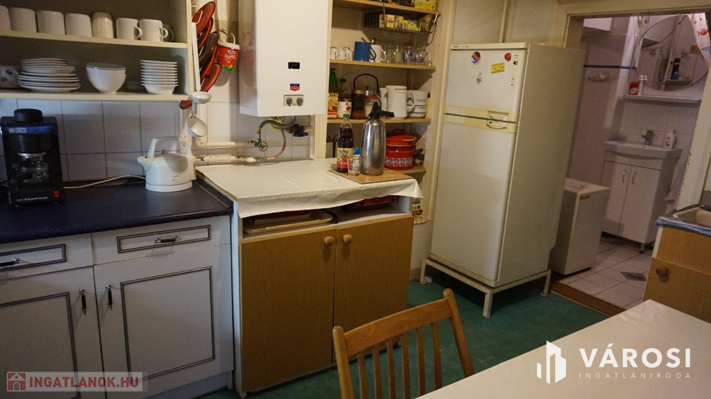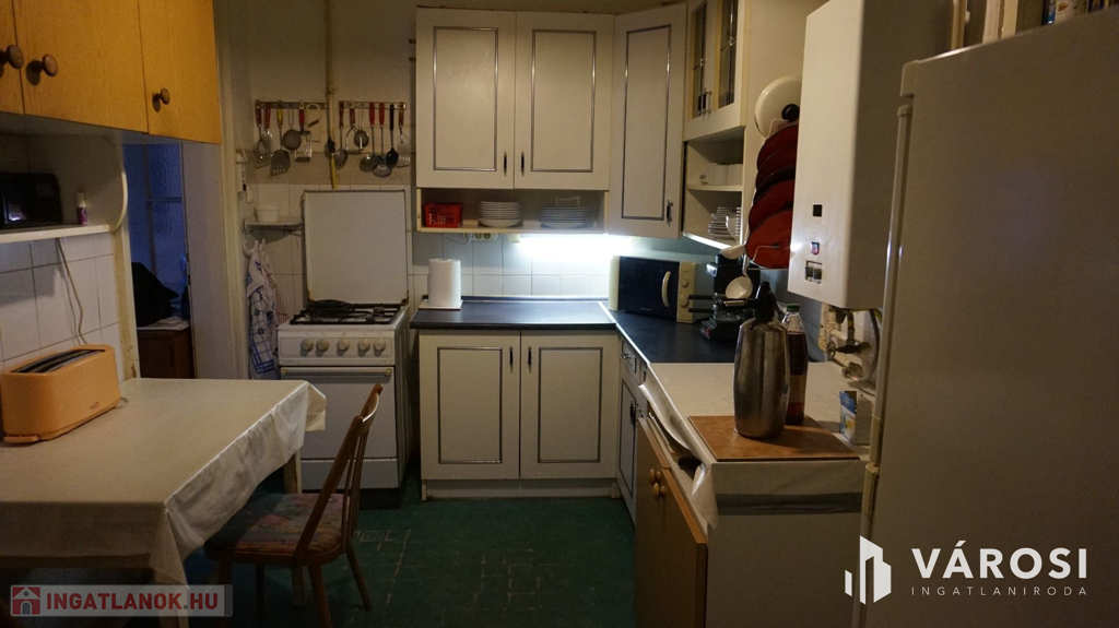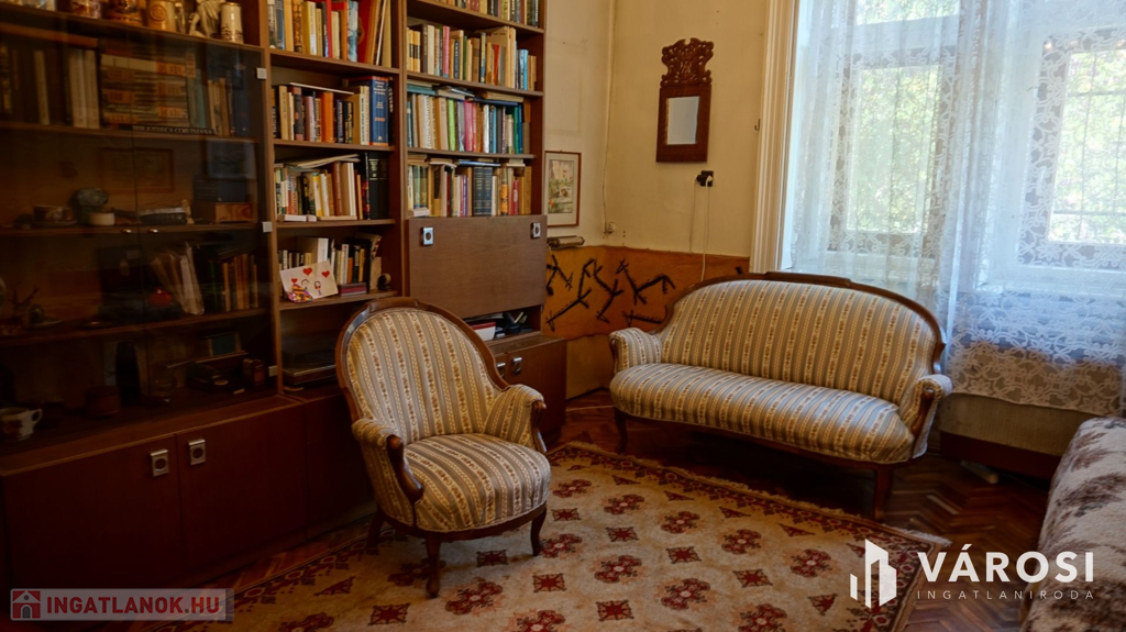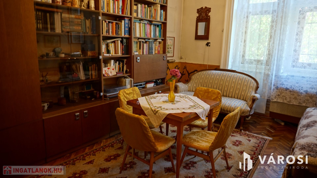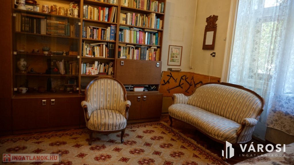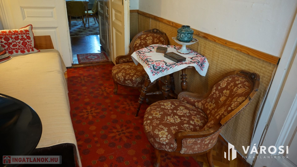 Az egész ingatlant áthatja a polgári életvitelre jellemző berendezés, bútorzat, tágas szobák, a polcokon a temérdek könyv. A lakásnak 2 bejárata van, egyik a kapualjból nyílik, másik a teraszról. A teraszról az előtérbe lépünk először /4 m2/, innen nyílik egy 10 m2-es szoba és a konyha /9 m2/, valamint a toalett /1 m2/. Az egész lakás körbejárható: a kisszobából tovább haladva a két 21 m2-es egymásba nyíló utcai szobába jutunk. A belső szobából nyílik a 4 m2-es fürdőszoba tusolóval és bidével, ami a konyhából is megközelíthető. Ill van egy 4 m2-es kamra, amely szintén a konyhából nyílik. Fűtése gázkonvektoros, a melegvizet átfolyós vízmelegítő szolgáltatja. Kisebb felújításokat végeztek az ingatlanon az utóbbi években, ekkor készült el a fürdőszoba, az utcai fal vízszigetelése, a kapualj hőszigetelése, ill az utcai ablakok cseréje. Viszont egy átfogó felújítás, korszerűsítés az új tulajdonos feladata lesz. Az ingatlan kiváló elhelyezkedése miatt minden gyorsan elérhető: bölcsőde, óvoda, iskola, buszmegálló, üzletek, éttermek, zöldséges, orvosi rendelő, gyógyszertár.