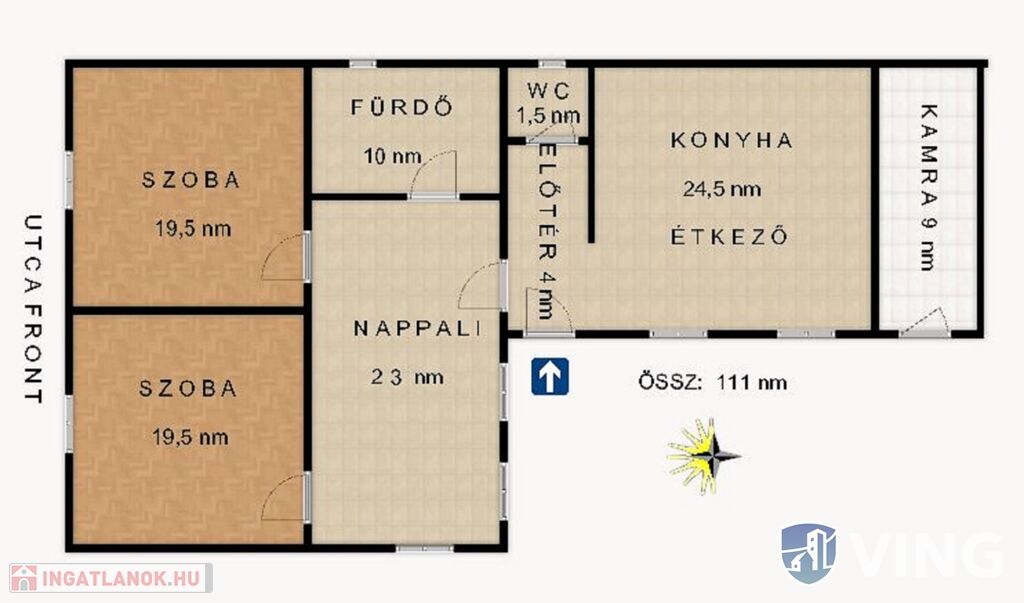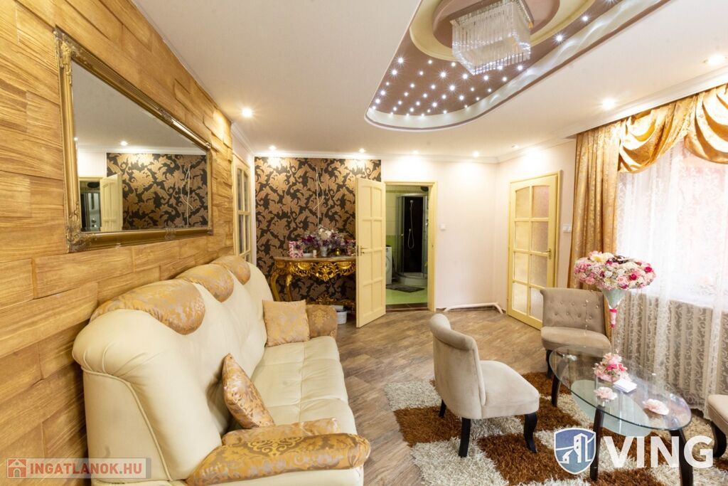 A lakásba belépve jobbra az amerikai konyhás étkező, balra pedig a nappali található, amelyből további két szoba nyílik. A szobák parkettások, a többi helyiség hidegburkolatú.