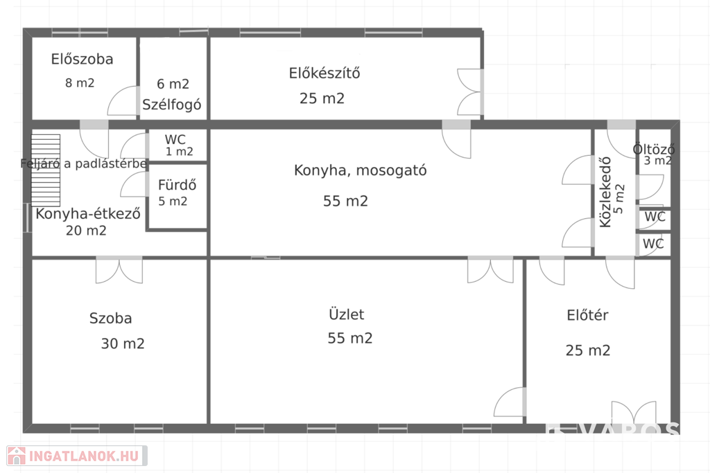-a nagyobb lakrész 170 m2, található itt egy előtér, egy tágas vendégfogadó helyiség, konyha, mosogató helyiség, férfi-női-, és személyzeti mosdó és öltöző. Viszont pár éve visszaminősítették lakóházzá, ezért némi átalakítás után akár 2 családnak is kényelmes otthona lehet (az aktuális földhivatali nyilvántartás szerint az egész ingatlan "Kivett lakóház, udvar, gazdasági épület"). A ház alatt tárolásra alkalmas száraz pince húzódik. Az udvaron kerti konyha, sütögető, egy nyitott és egy fedett terasz, raktár, 2 garázs, fedett kocsibeálló is található. Ha mégis úgy dönt leendő tulajdonosa, hogy üzletet, pizzaműhelyt, vendéglőt, cukrászdát, vagy kávézót, egyéb közösségi teret szeretne nyitni újra az ingatlanban, könnyűszerrel megteheti, a feltételek adottak hozzá.