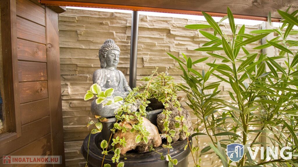 A 410 nm-es udvar minden négyzetmétere parkosított, mely a gondos tervezésnek köszönhetően tovább erősíti a ház kiemelkedő tulajdonságait.
