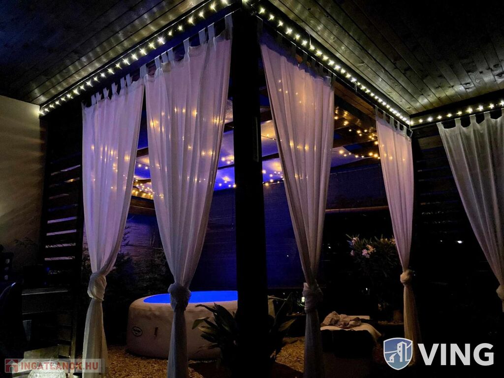 A nappaliból egy nagyméretű teraszajtón keresztül lehet kijutni a fedett teraszra, amely több mint 26 nm alapterületű. Az itt található kültéri konyha hideg - meleg vízzel ellátott. A terasz és az egész udvar a dekorvilágításnak köszönhetően sötétedés után különösen megnyerő látvány.