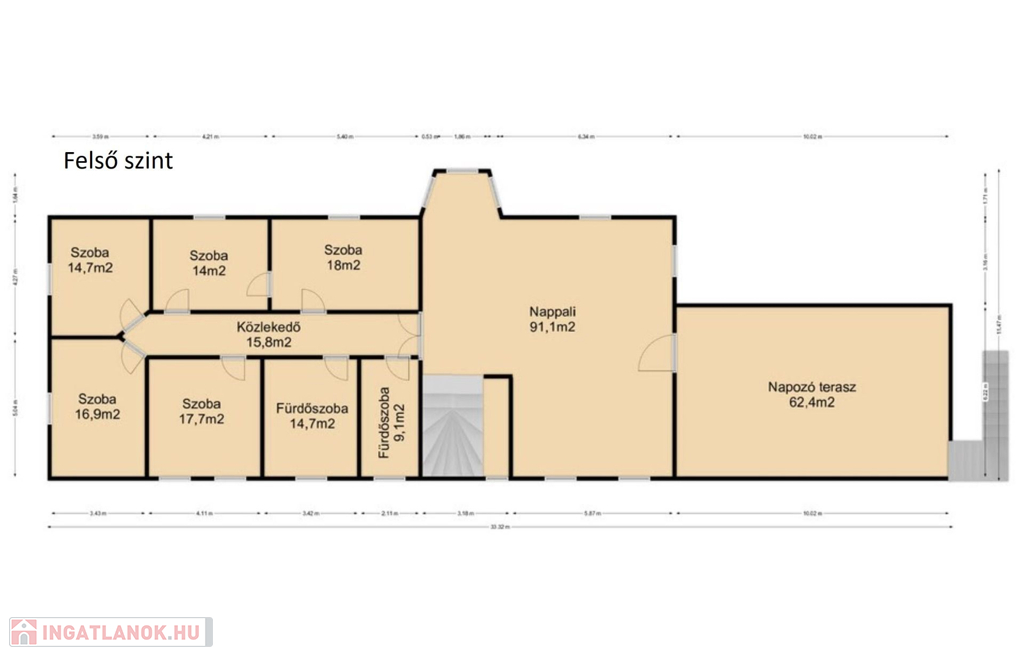 Felső szint: 5 külön bejáratú szoba, közlekedő, 2 fürdő, nagy méretű nappali közvetlen teraszkapcsolattal.