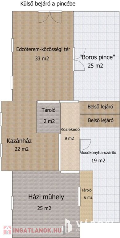 • Pince: 139 m²-es pince borospincével, sportolásra és baráti összejövetelekre alkalmas helyiséggel, mosókonyhával, vegyes tüzelésű és gázkazánnal, tárolókkal.