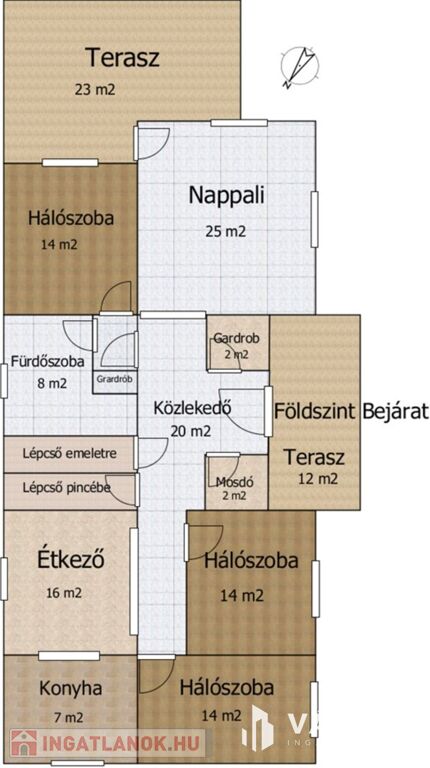 • Földszint: Fedett terasz, előtér, gardrób, vendég mosdó, nagy nappali teraszkapcsolattal, hálószoba, fürdőszoba, két szoba, konyha-étkező.