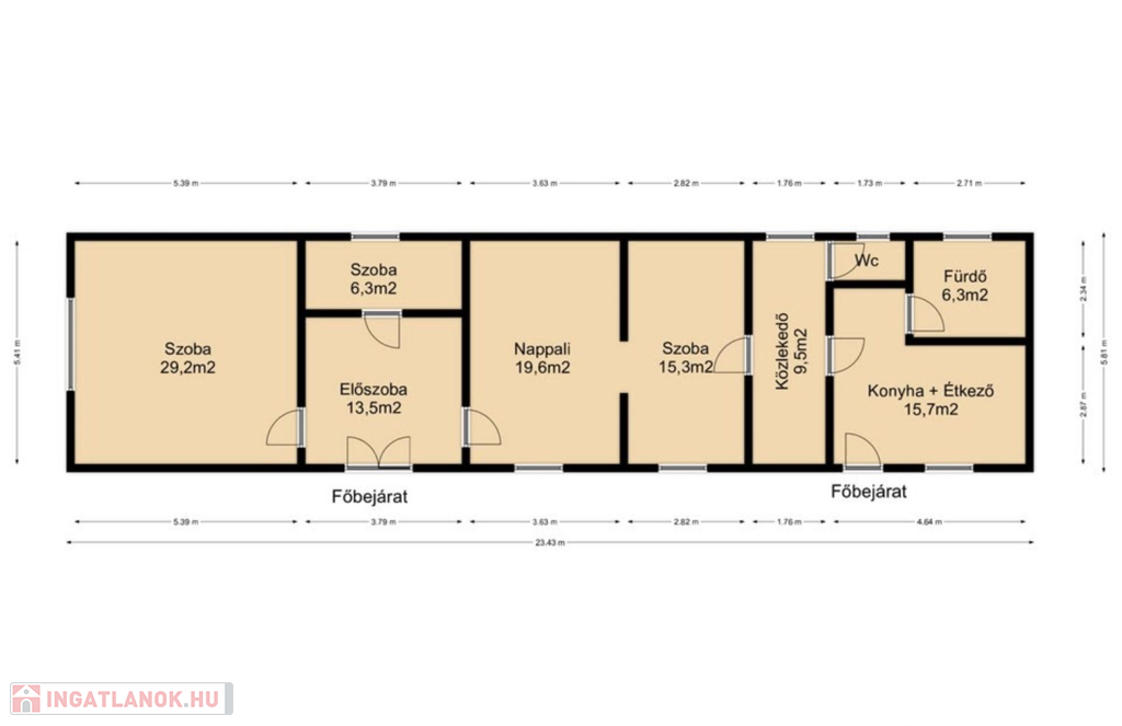 Belső lakrész helységei: nappali, 3 szoba, előszoba, közlekedő, külön fürdő, külön mellékhelység, konyha étkező.