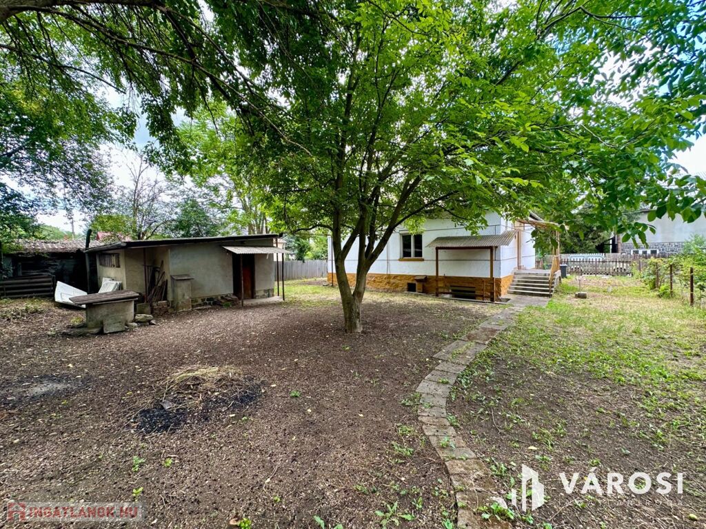 A cca. 800 nm-es telek 3/4 része sík, körbekerített, területén autóbeálló, lakható melléképület (közművesített), garázs található.