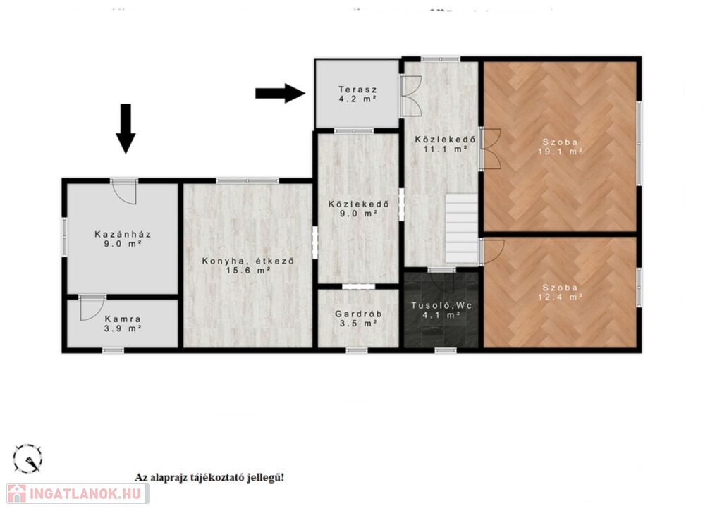 A szobák parkettával és hajópadlóval burkoltak, a közlekedő laminált padlót, míg a konyha és kazánház linóleumot kapott. A fürdőszoba nemrég esett át felújításon, így modern kerámiaburkolattal rendelkezik.