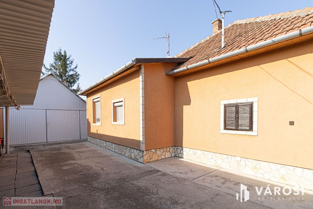 A telek közel 600 m², amelyen a házon kívül található egy 28 m²-es, könnyűszerkezetes, fűthető garázs, továbbá fedett tárolók és egy ásott kút.