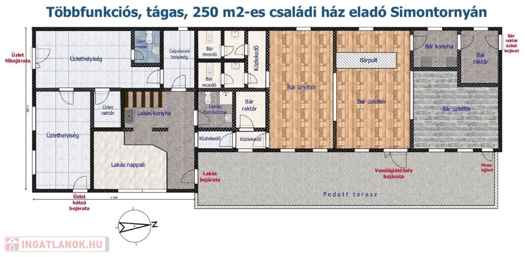 Az alaprajzon látható módon, az ingatlannak jelenleg 5 külső bejárata van. Az utolsó használat szerint a ház több funkciót látott el, jelenleg az ingatlanon belül van egy két bejáratos üzlet, egy kis lakás, valamint egy korábban vendéglátóhelyként üzemeltetett nagy egység, szintén két bejárattal.
