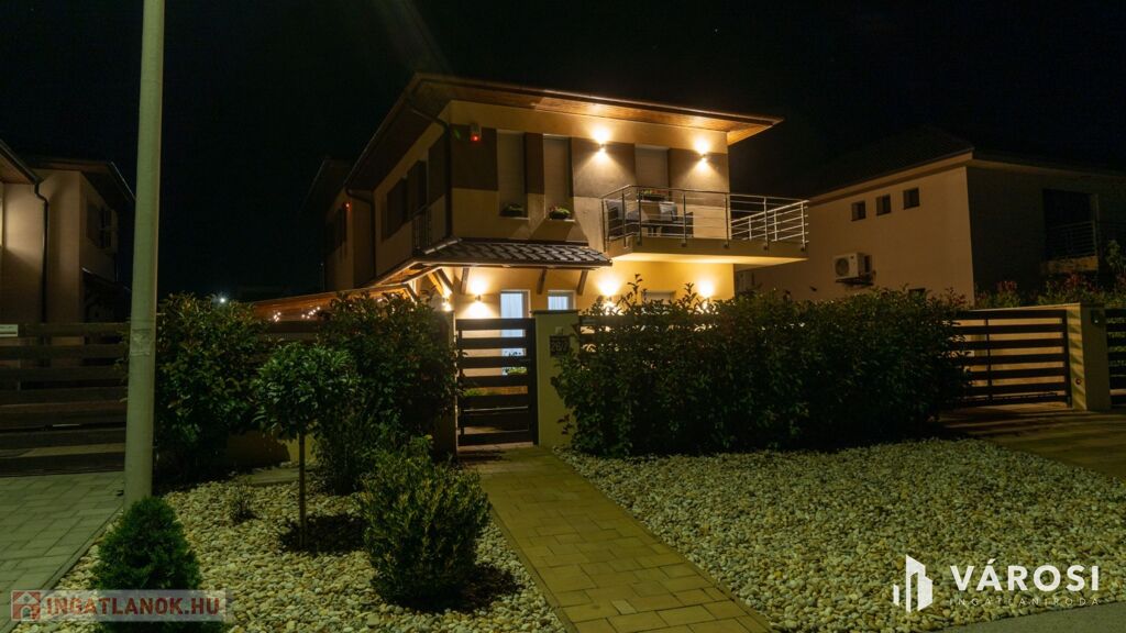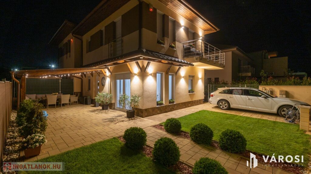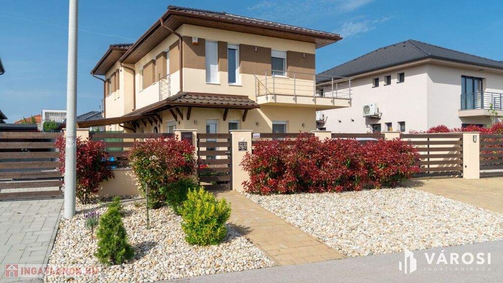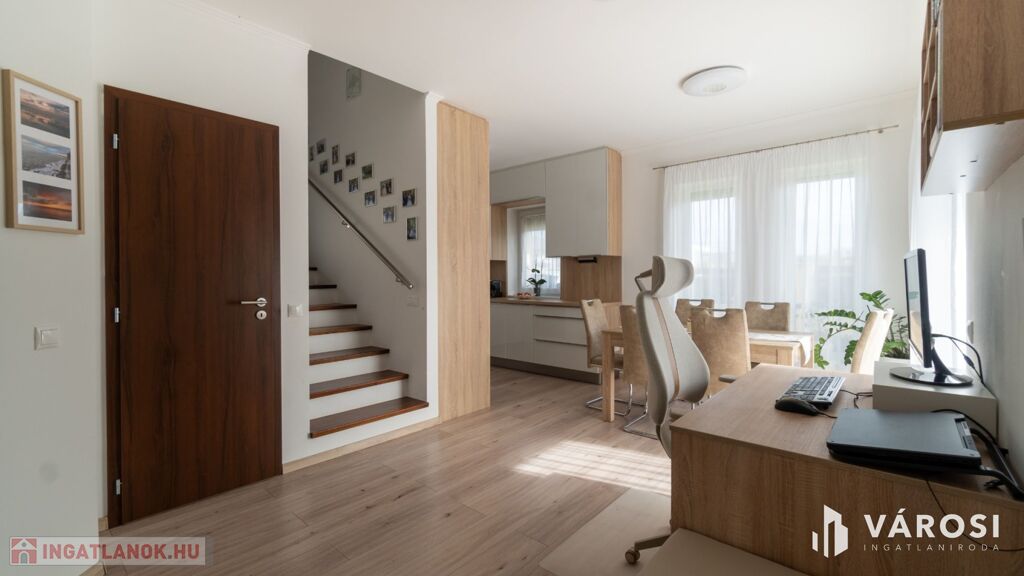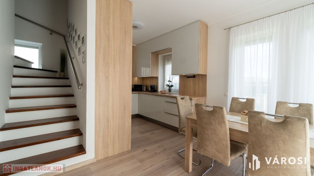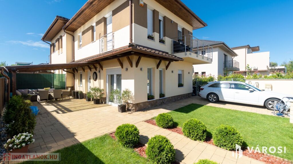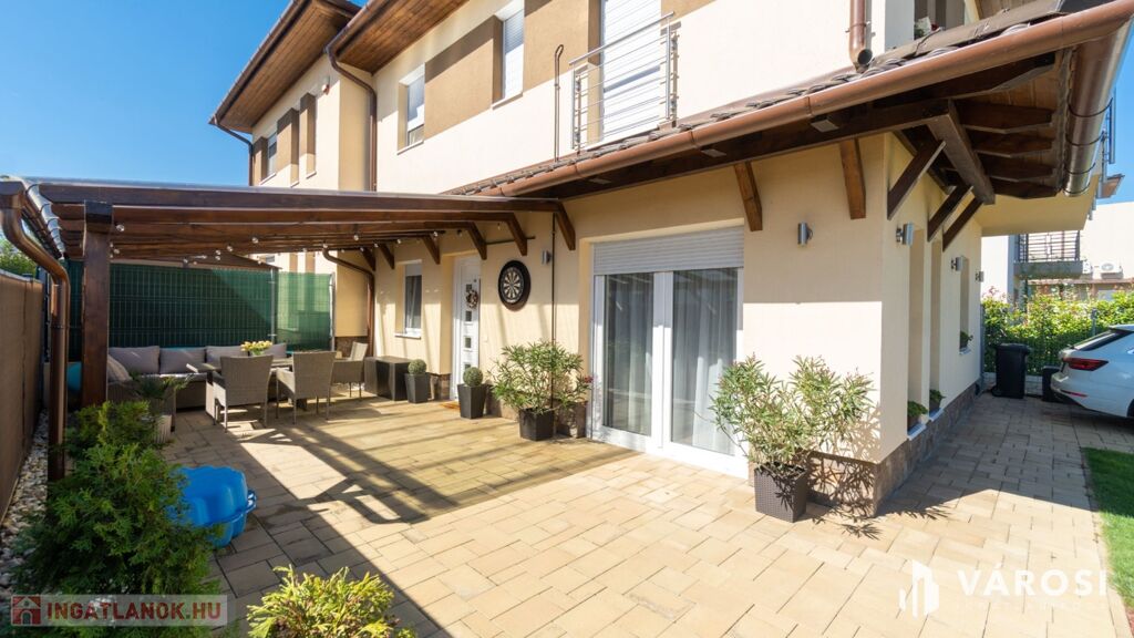 Eladó Siófok Sóstó városrészén egy 2020-ban épült ikerház utcafronti része. Az épület kiváló állapotban van. Precízen átgondolt, rendkívül praktikusan megtervezett bruttó 115 m²-es házról van szó, melyhez 30 m² térkövezett terasz (melyből 20 m² fedett), egy nagy 7m²-es erkély, valamint udvaron belüli térkövezett gépjárműbeálló tartozik. Az ingatlan külön helyrajzi számon van saját telekhányaddal, mely 174 m². Összesen 86 m² nettó lakótérről beszélhetünk. A földszinten található az amerikai konyhás nappali, egy szoba, egy fürdőszoba és egy külön WC. Az emelet 2 szobával, egy nagy fürdőszobával, gépészeti helyiséggel, közlekedővel, valamint egy tágas 7 m²-es erkéllyel rendelkezik.
