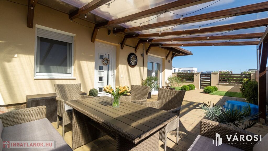 A kertkapcsolatos ingatlanhoz egy gyönyörű, ízlésesen parkosított kertrész, valamint 20 m² fedett térkövezett terasz is tartozik ahol akár grillezhet is a család és a barátok társaságában.
