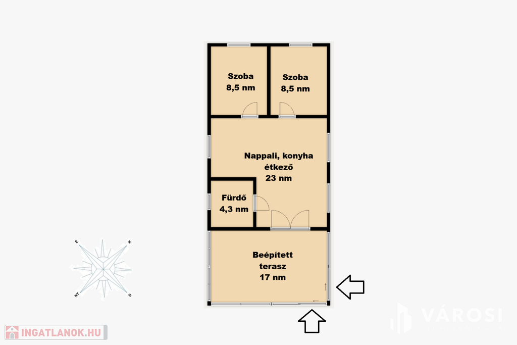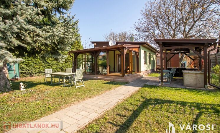 Az 577 négyzetméteres telken épült, 62 négyzetméteres tégla falazatú házban amerikai konyhás nappali étkezővel, 2 szoba és fürdőszoba található. A ház előtti terasz be lett építve, 3 rétegű üvegezéssel ellátott oldalfalakkal és hatalmas tolóajtóval. Ezeket kinyitva, közvetlen kapcsolat nyílik a csodás kerthez. Akár mind a 4 évszakban használható! Az életteret növeli a ház mellé épített szabadtéri konyha is. A ház igény szerint a teljes berendezéssel együtt eladó. A ház mellett további kettő kis tároló került megépítésre, a kerti eszközök tárolására.
