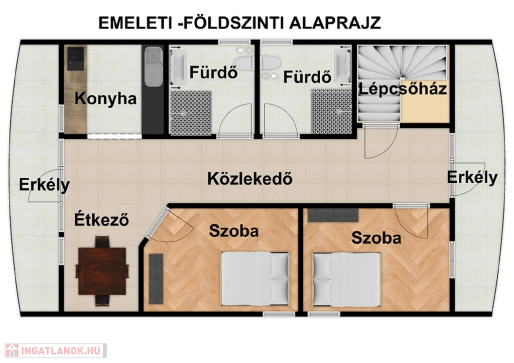 -földszinten: nappali(étkező), 2 fürdőszoba, konyha és 2 lakószoba