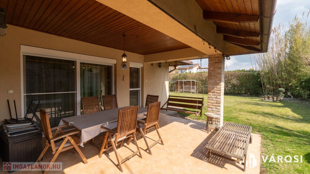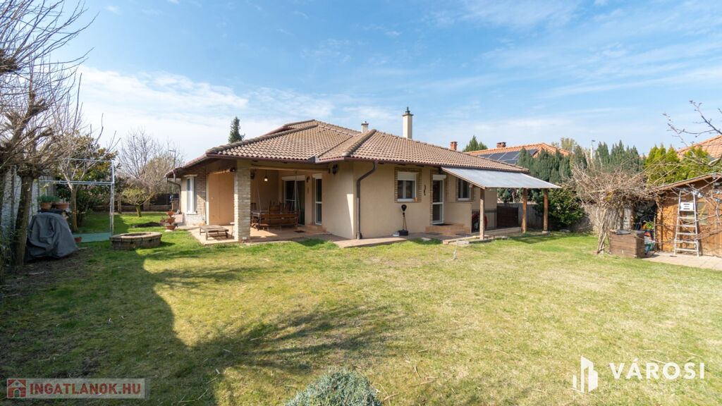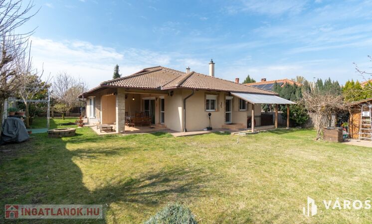 A 40 nm-es, kényelmes duplagarázs mellett a kovácsoltvas jellegű, távvezérelt kapun keresztül több autó számára is biztosított a bejutás. A kert igazi oázis: a dísznövények és gyümölcsfák között egy kerti tároló is segít a rendszerezésben. Ezen felül egy fúrt kút is található.