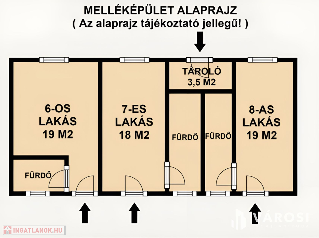 - Egy 60 m²-es földszintes melléképület, amelyben 3 lakóegység lett kialakítva, mindegyik klimatizált és rendelkezik saját fürdőszobával.