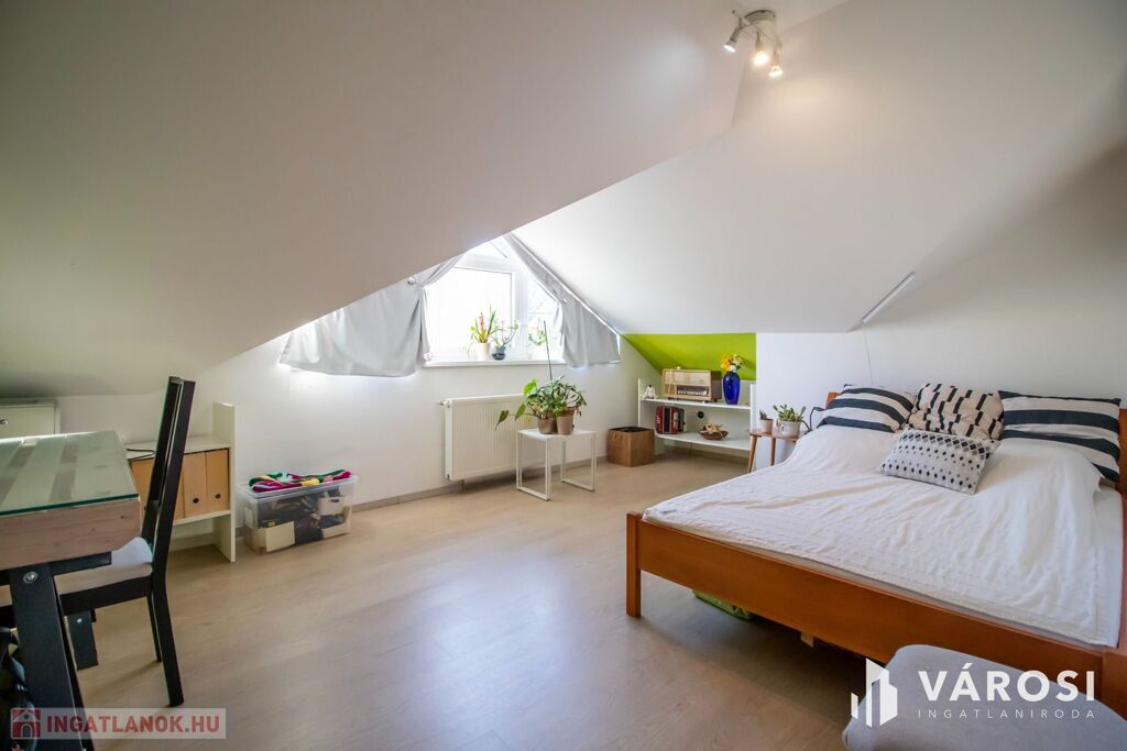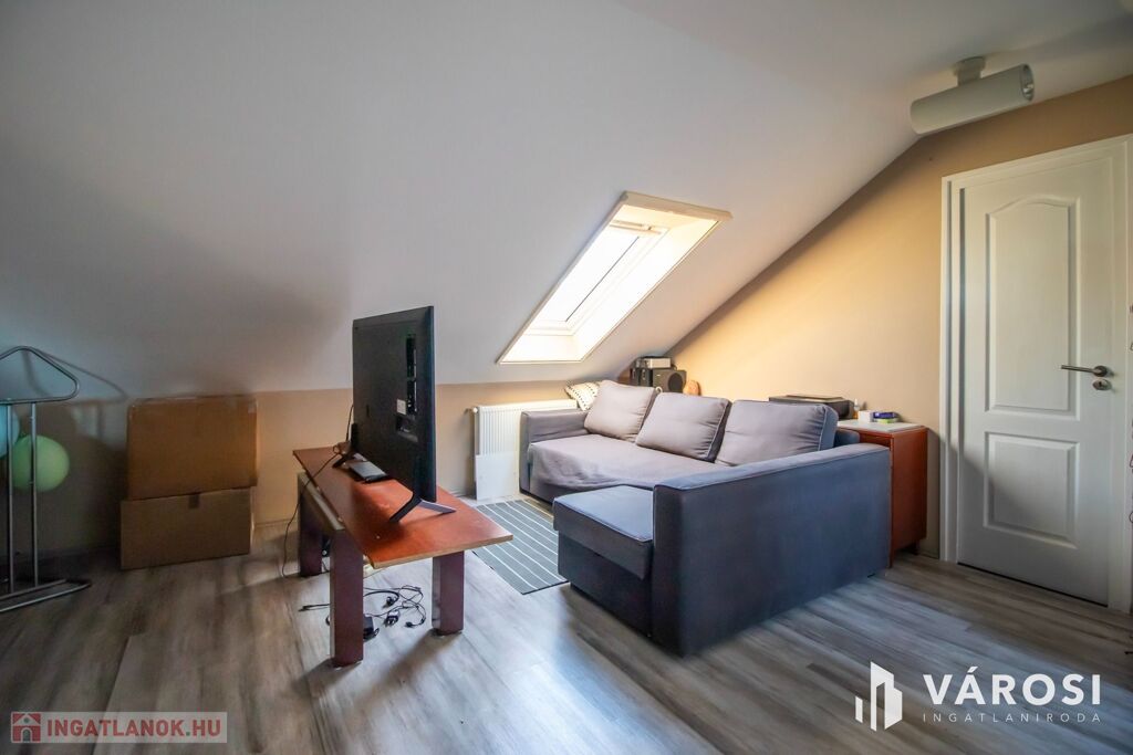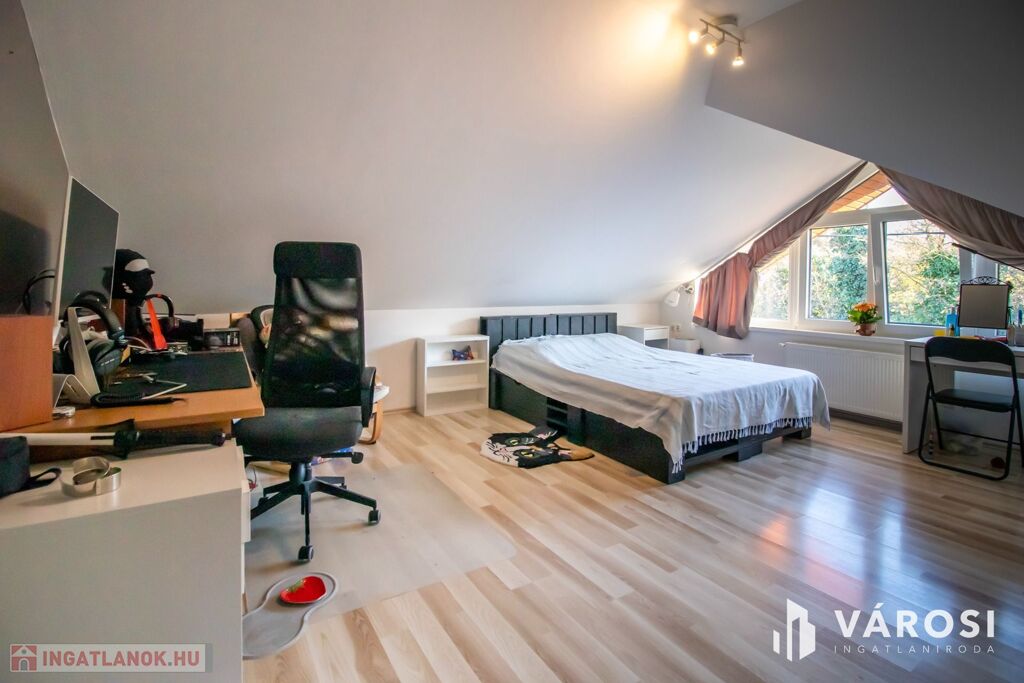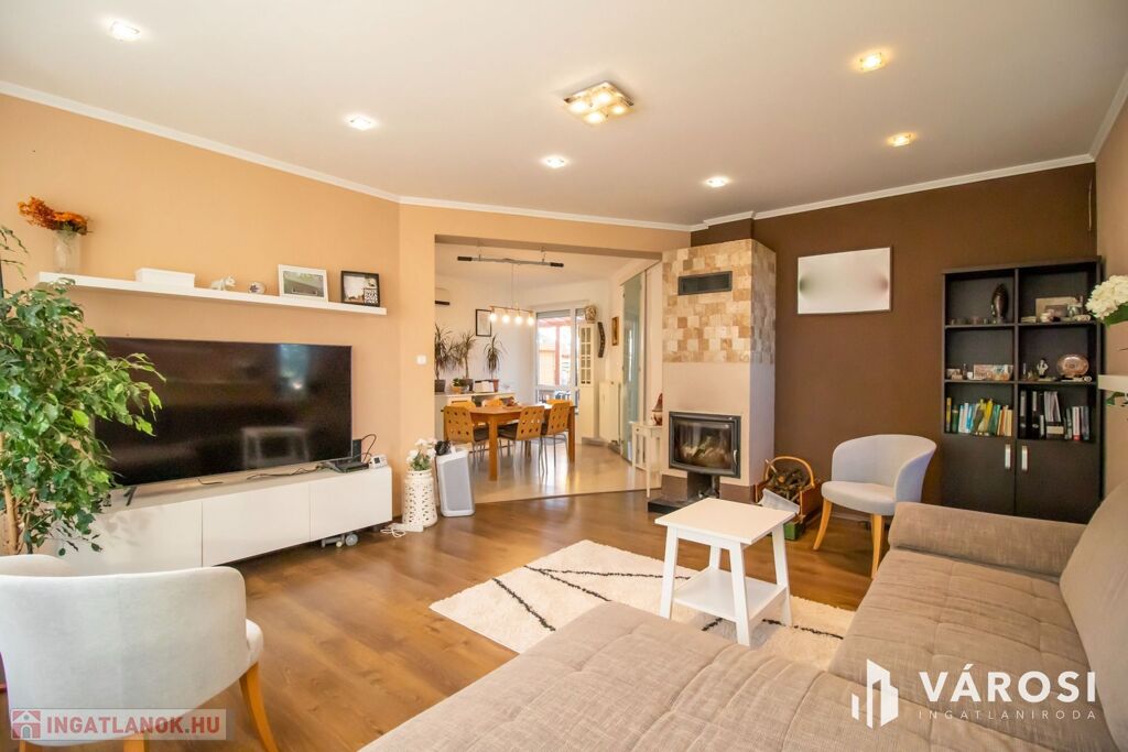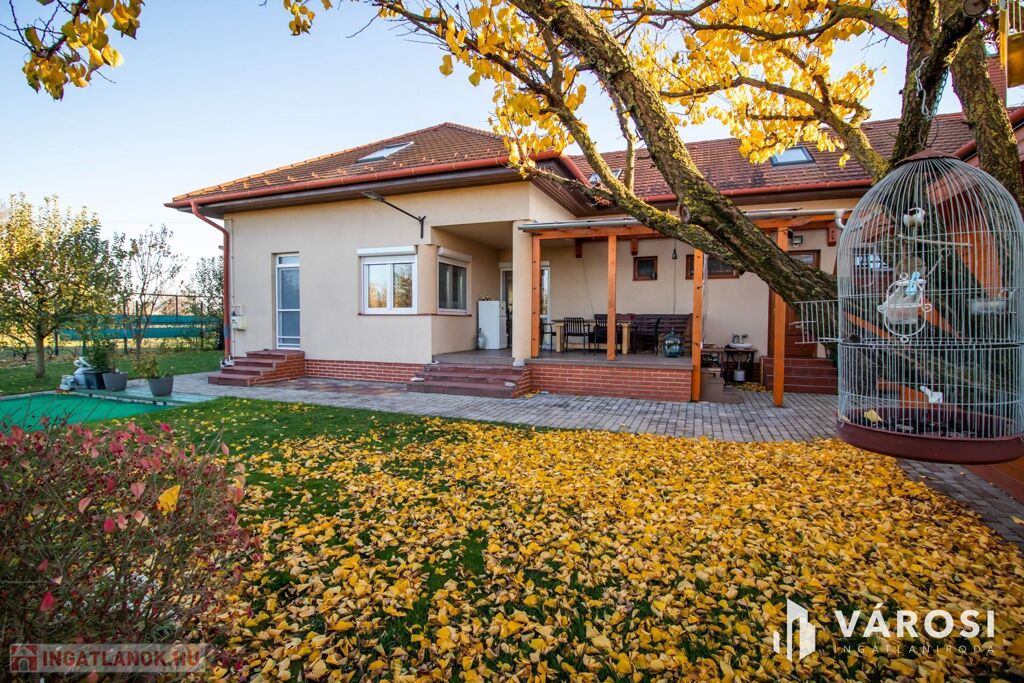 A ház 2001-ben nagycsaládosoknak készült, ezért a bruttó 225, nettó 200 négyzetméteren van benne az amerikai konyhás nappalin kívül még 5 külön hálószoba, 2 fürdőszoba, plussz egy külön WC és egy két autó beállása alkalmas, 32 négyzetméteres, fűtött garázs is. Udvar felől egy nagy, fedett terasz is lehetőséget nyújt a szabadban való pihenésre. 2013-ban történt egy felújítás és azóta is szinte új állapotban van.