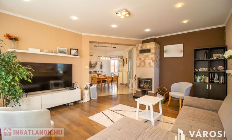 A ház 2001-ben nagycsaládosoknak készült, ezért a bruttó 225, nettó 200 négyzetméteren van benne az amerikai konyhás nappalin kívül még 5 külön hálószoba, 2 fürdőszoba, plussz egy külön WC és egy két autó beállása alkalmas, 32 négyzetméteres, fűtött garázs is. Udvar felől egy nagy, fedett terasz is lehetőséget nyújt a szabadban való pihenésre. 2013-ban történt egy felújítás és azóta is szinte új állapotban van.