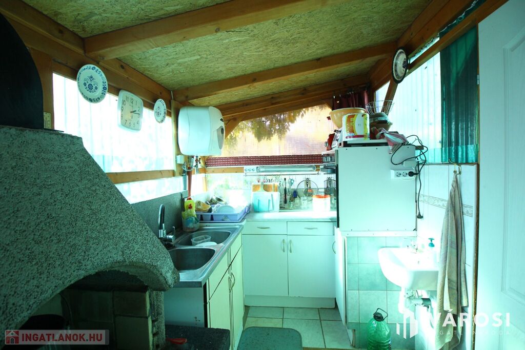 A kertben kialakítottak közvetlenül a dísztó és a sziklakert mellett egy összkomfortos nyári konyhát étkezővel 30m2-en ahol beépített tűzhely, sparhelt, kemence, sütő, grillező, mosogató stb. is beépítésre került. Mellette kényelmes kör panorámás 30 nm2-es ebédlő lett kialakítva, itt 18-20 fős társaság kényelmesen vendégül látható.