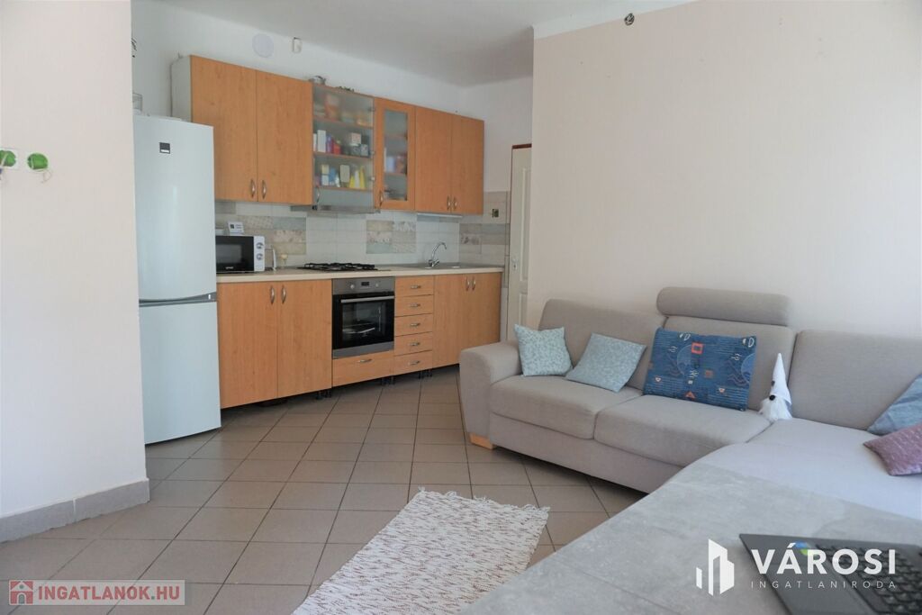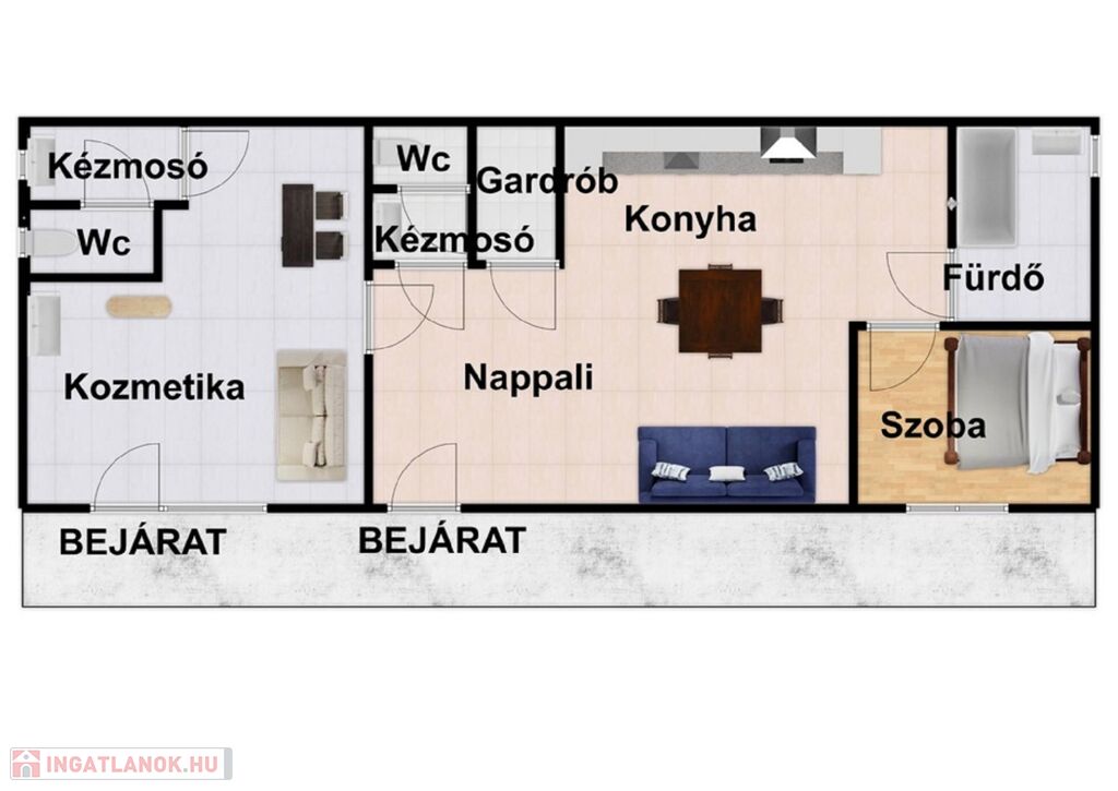 -60nm-es ingatlan(17nm-es kozmetikai szalon(wc-vel és kezelő helyiséggel),amerikai konyhás nappali, lakószoba, fürdőszoba, gardrób és külön wc)
