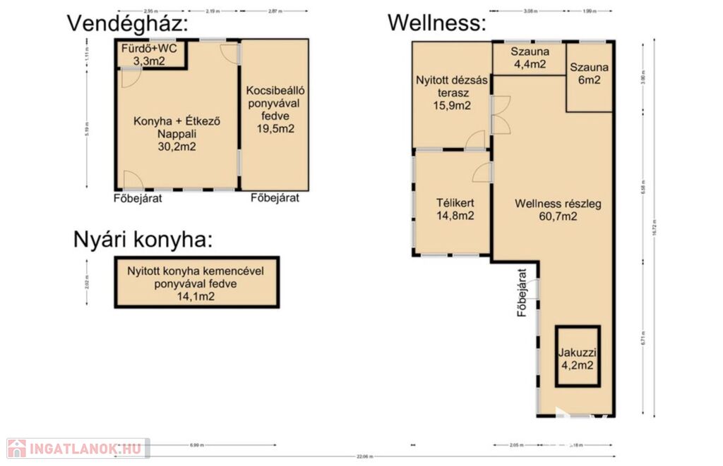 A 2200 m2-es udvarban megépítésre került egy főépület, (családi ház), egy kis vendégház, egy nyárikonya, egy Wellness részleg, valamint szerszámtároló és egy földpince.