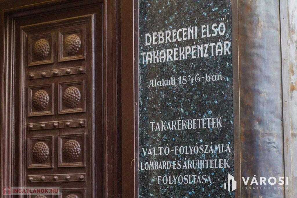 Debrecen főutcáján, a régi városháza szomszédságában épült a város legrégibb pénzintézete, a Debreceni Első Takarékpénztár palotája, szecessziós stílusban. Az épület egykor a város ékessége volt, hiszen az egyre terjedő építészeti divat Debrecent is elérte.Modern kori funkciója közismert: 2005-től a Debreceni Művelődési Központ székhelye, közösségi, kulturális események, kiállítások otthona a Pódiumtermet és a Kiállító termet (Belvárosi Galériát) is magába foglaló épület volt. A saroképület ma ismert formáját az évszázad második évtizedének elejére érte el. Elegáns külsejét elsősorban annak köszönhette, hogy a Takarékpénztár elhatározta, a bérbe adható boltok és lakások mellett, bővíthető banki tér jöjjön létre és a kaszinónak is kényelmesebb helyet akartak. Az új takarékpénztár gazdagon díszített, háromemeletes székházát ifjabb Rimanóczy Kálmán nagyváradi műépítész tervei alapján 1911-12-re építették fel.„A debreczeni Első Takarékpénztár háromemeletes fényes, új palotája ez idő szerint Debreczennek legszebb, legnagyobb, tegyük hozzá, legjövedelmezőbb bérpalotája volt…, és méltó dísze még ma is Debrecen főutcájának! Ezt a csodálatos impozáns ingatlant kínáljuk most megvételre, amelyben rengeteg fantázia van, és megérdemli, hogy az új tulajdonosa, megvalósítsa benne az álmai üzleti tevékenységét, ahogyan a régi tulajdonosai is ezt tették, nem kis sikerekkel!