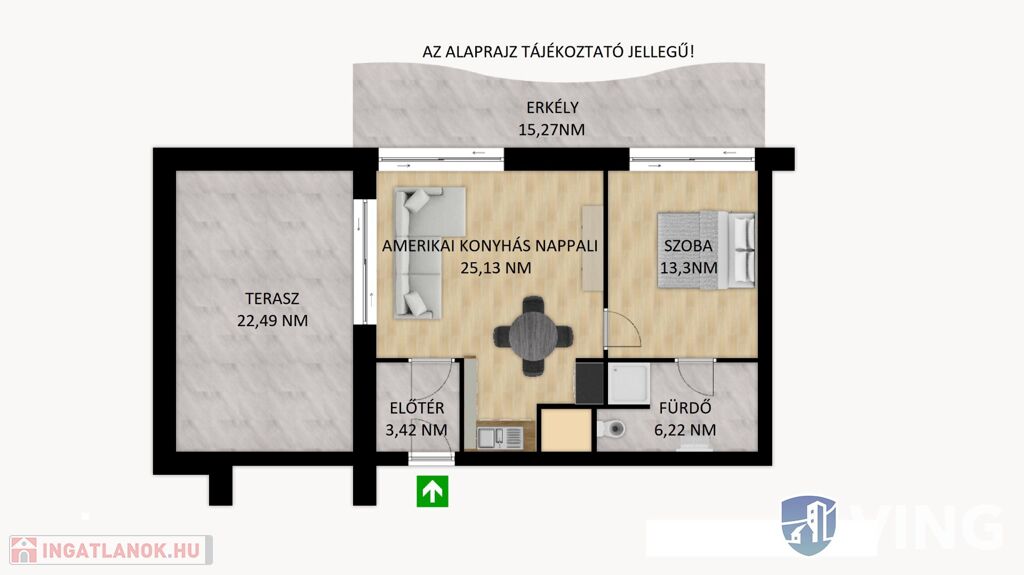 A hirdetésben részletezett lakás az épület második emeletén helyezkedik el, elrendezése a mellékelt alaprajzon látható. A belső lakótér 48 négyzetméter ráadásként 38 négyzetméteres terasszal.
