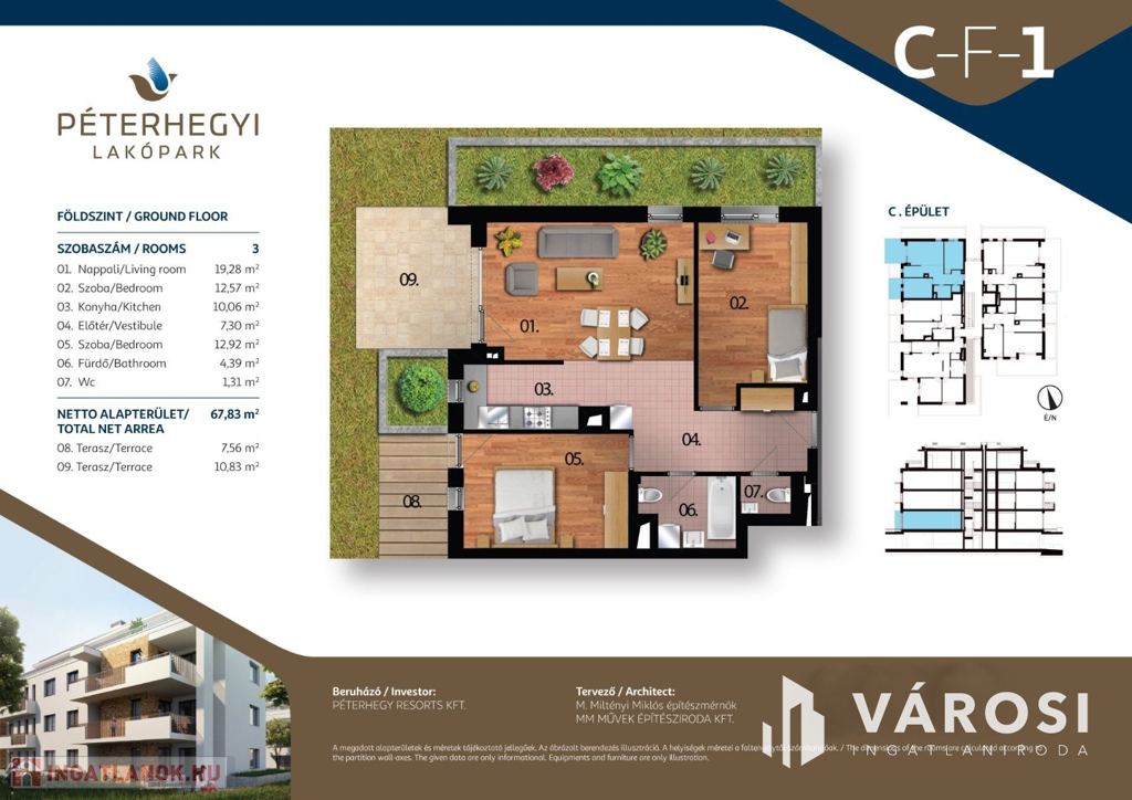 A hirdetésben szereplő lakás a C épület földszintjén található, amerikai konyhás nappali +2 hálószobás elrendezésű.