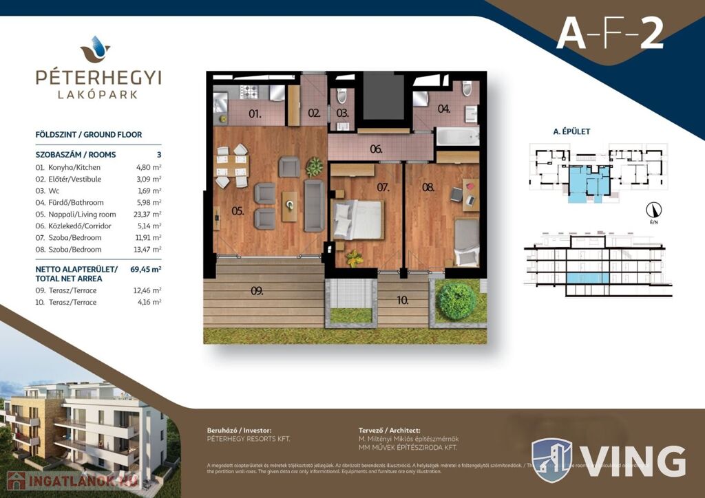 Alapterülete 70 m2 + 20 m2 terasz.