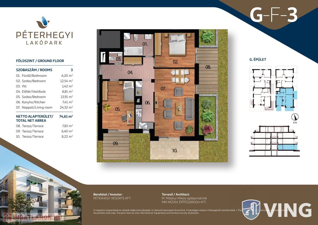 Alapterülete 74,61 m2 + 24 m2 terasz.