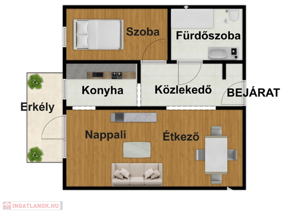 -47m2-es lakás(1 szoba, fürdőszoba wc-vel, konyha, nappali és közlekedő)