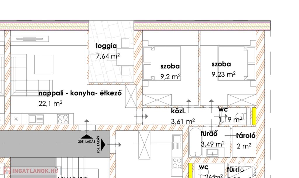 A 1 db amerikai konyhás nappalival, 2db hálószobával, 1 db fürdőszobával, közlekedővel, loggiával rendelkezik.