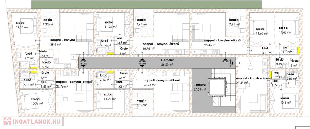 A 1 db amerikai konyhás nappalival, 2 db hálószobával, 1 db fürdőszobával, közlekedővel, loggiával rendelkezik.
