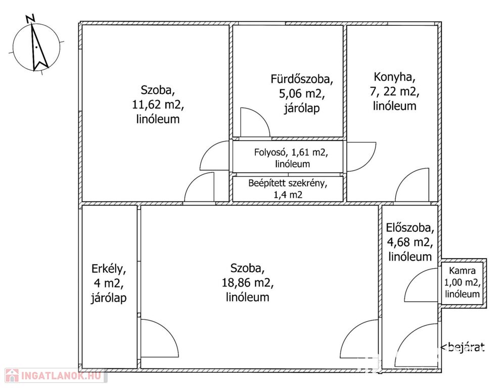 A szobák, a folyosók, és a konyha jelenleg linóleumos melegburkolattal rendelkeznek.